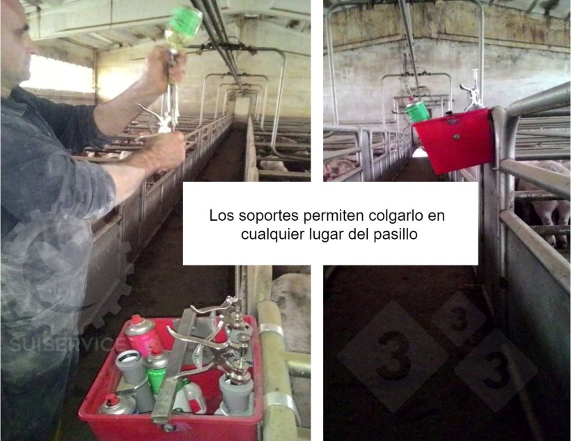 Se sujetan tres tubos de plástico con abrazaderas al cubo que serán los contenedores para tres jeringas diferentes que podremos utilizar para distintos tratamientos antibióticos o antiinflamatorios. La longitud del tubo se calcula en función de la longitud de la jeringa, incluida la aguja, para que cuando se coloque en su interior, la aguja no toque el fondo y, por tanto, no se dañe, aunque siempre es mejorar retirar la aguja después de cada tratamiento. Los soportes externos permiten apoyarlo en las separaciones de los corrales, a una altura cómoda para su uso.
