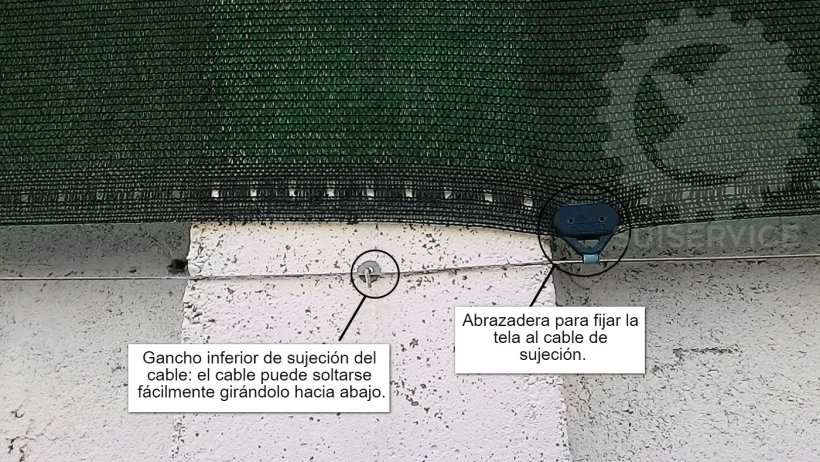 Dos cables de acero trenzado paralelos se fijan por encima y por debajo de las ventanas a lo largo de toda la nave, equipados en los extremos con un tensor para mantener la tela bien tensada.
