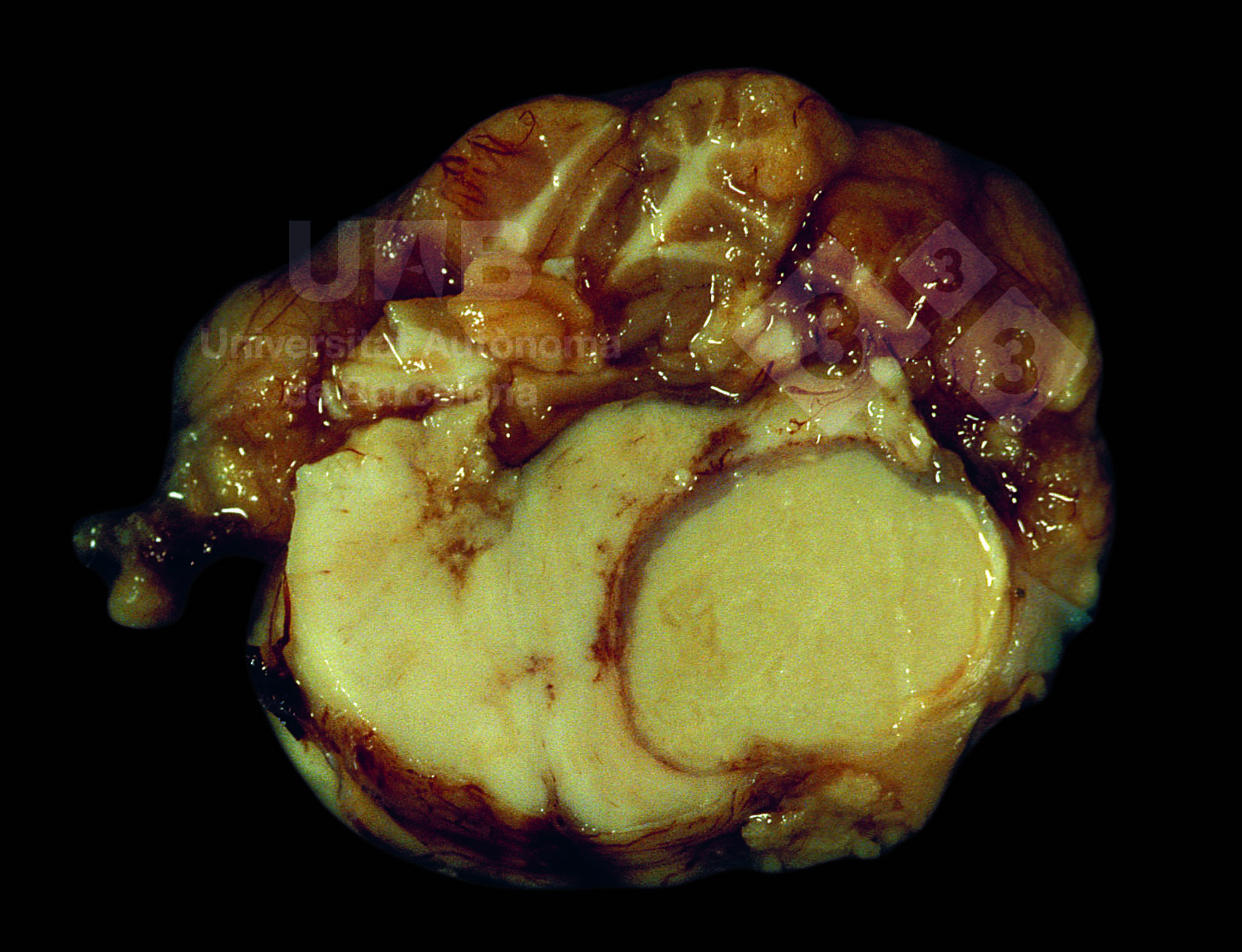 Esta lesión corresponde a un absceso, que es un foco nodular de material purulento y necrótico rodeado por una cápsula fibrosa. Los abscesos, en cualquier localización, están causados por infecciones bacterianas. El absceso de la foto está en el tronco cerebral, probablemente como consecuencia de la extensión de la infección bacteriana de una otitis interna.