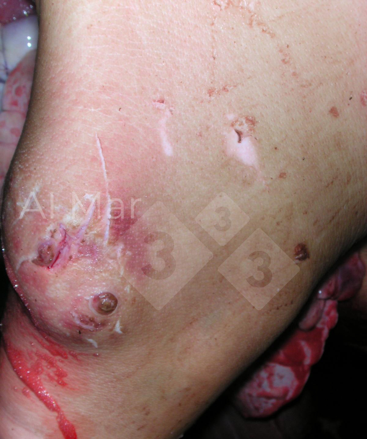 La artritis purulenta en la articulación del codo es consecuencia del roce con el suelo de la granja. Tras erosionarse la piel se abre la vía de entrada a los gérmenes que contaminan la cavidad articular.