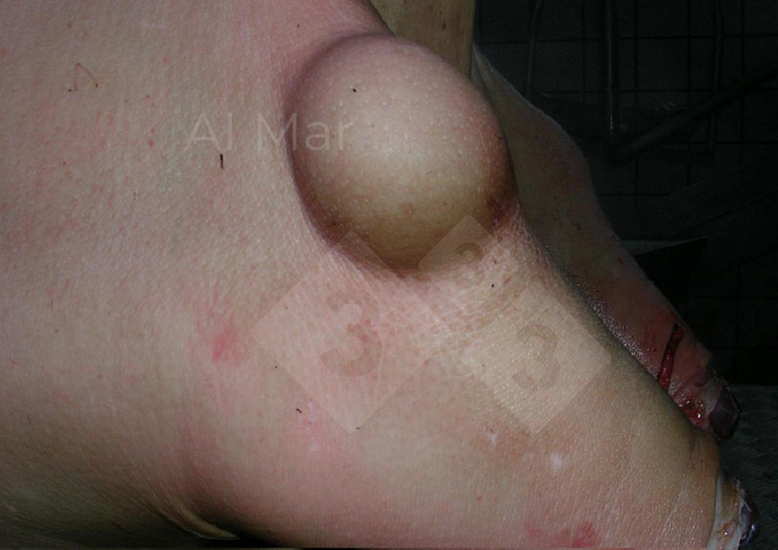 La artritis serosa se manifiesta, en este caso, como una inflamación en la articulación del codo con forma y tamaño de pelota de tenis. Al realizar un corte en la lesión aparece un líquido filante y transparente, características normales del líquido sinovial.