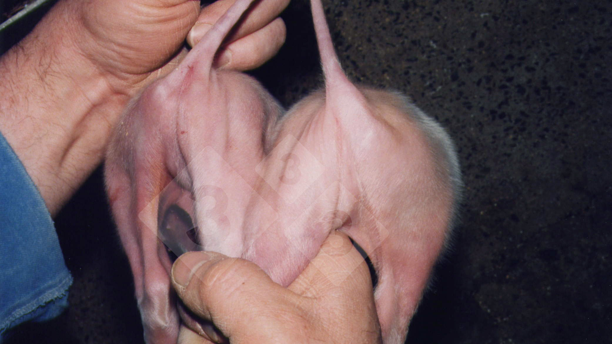 El lechón nace sin un ano externo porque ha desarrollado un extremo ciego en su recto, a 5-10mm del exterior, dentro de la pelvis. Esta condición es heredable, pero de incidencia baja (0,17%). No vale la pena tratar de repararlo quirúrgicamente porque la apertura artificial se vuelve a cerrar. El abdomen de los lechones afectados aumenta de tamaño y mueren. Hay que asegurarse de cubrir la cerda con otro macho para la próxima gestación.