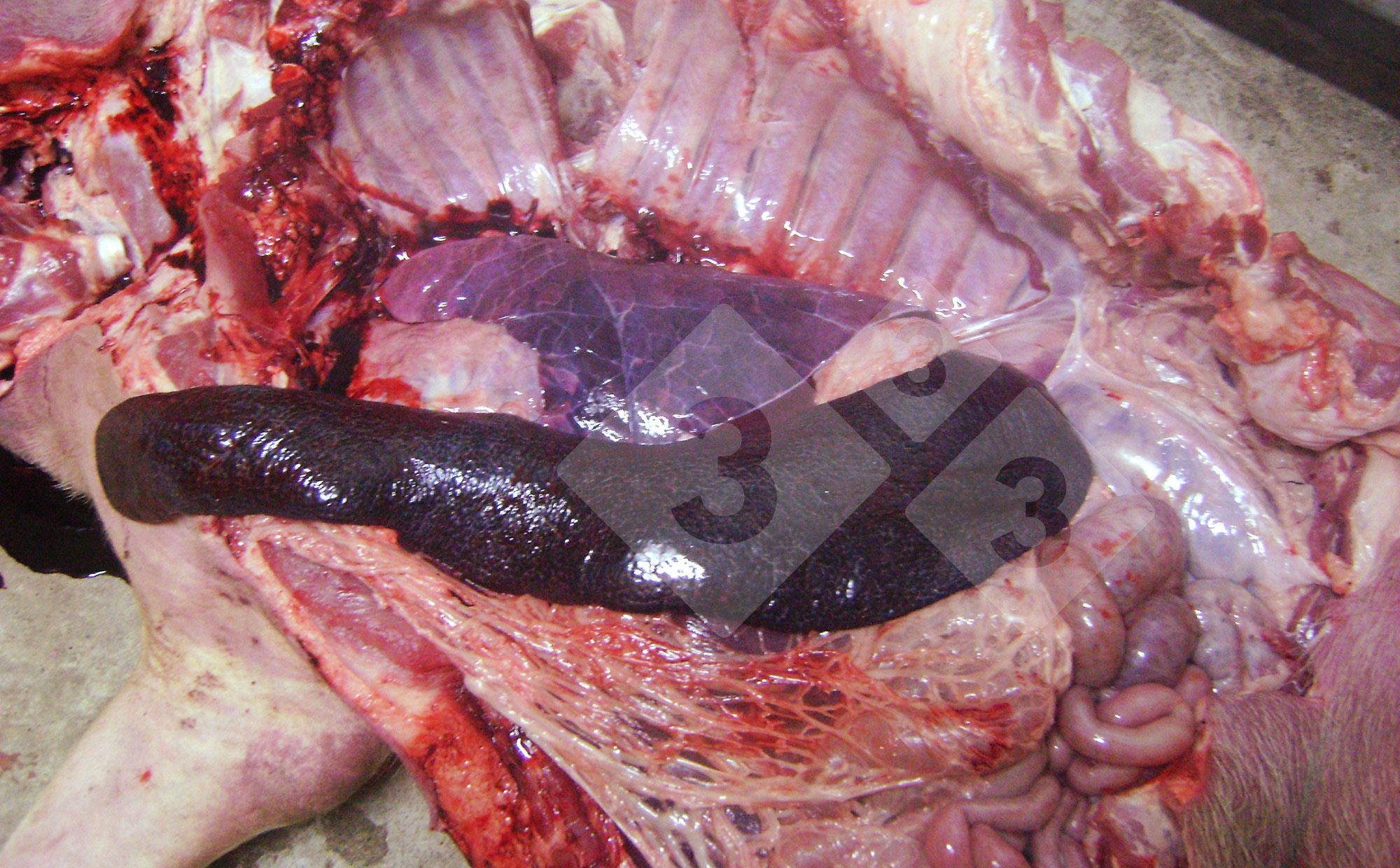 Lesión post mortem encontrada en una animal que causó baja con muerte repentina. Un porcentaje elevado de los animales presentan fiebre elevada y apatía. Ha habido casos de abortos y animales con manchas violáceas en la piel.