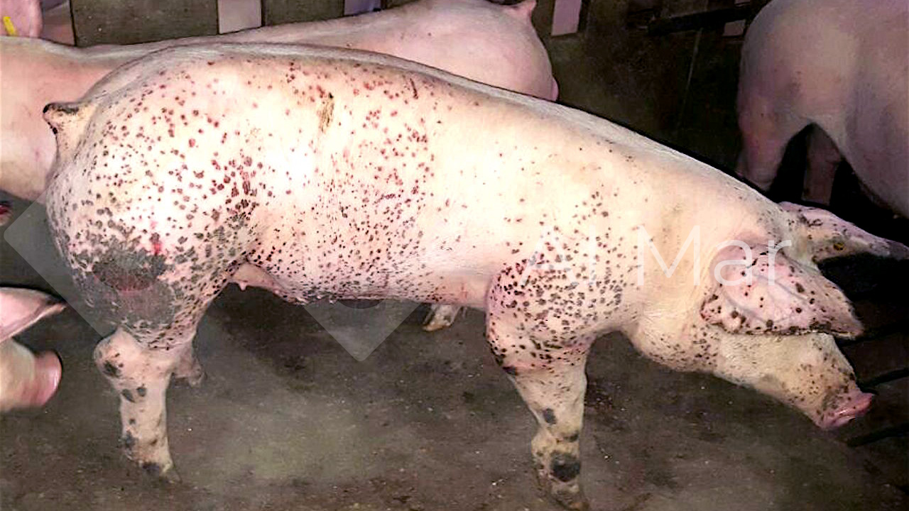 La lesión observada en la piel de un cerdo de cebadero es una dermatitis hemorrágica necrotizante especialmente en el área perineal, extremidades posteriores, continuando más leves por abdomen, extremidades anteriores acabando en orejas.