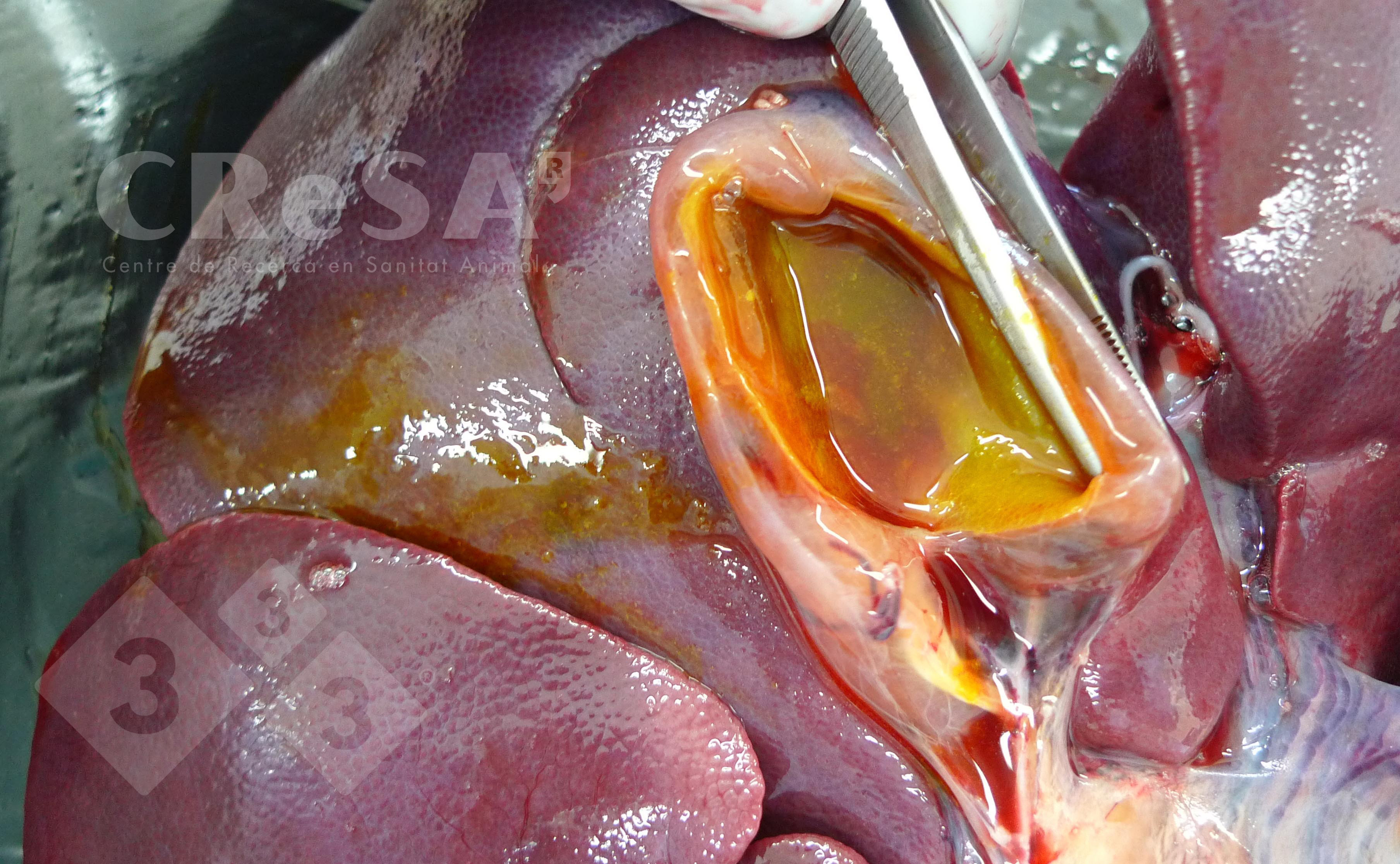 El virus de la peste porcina africana (PPA) puede producir un edema en la pared de la vesícula biliar, como se puede ver en esta foto. Sin embargo, se trata de un cambio bastante inespecífico que puede ser observado en muchos procesos patológicos incluyendo enfermedad de los edemas, hepatosis dietética, toxicosis, etc.