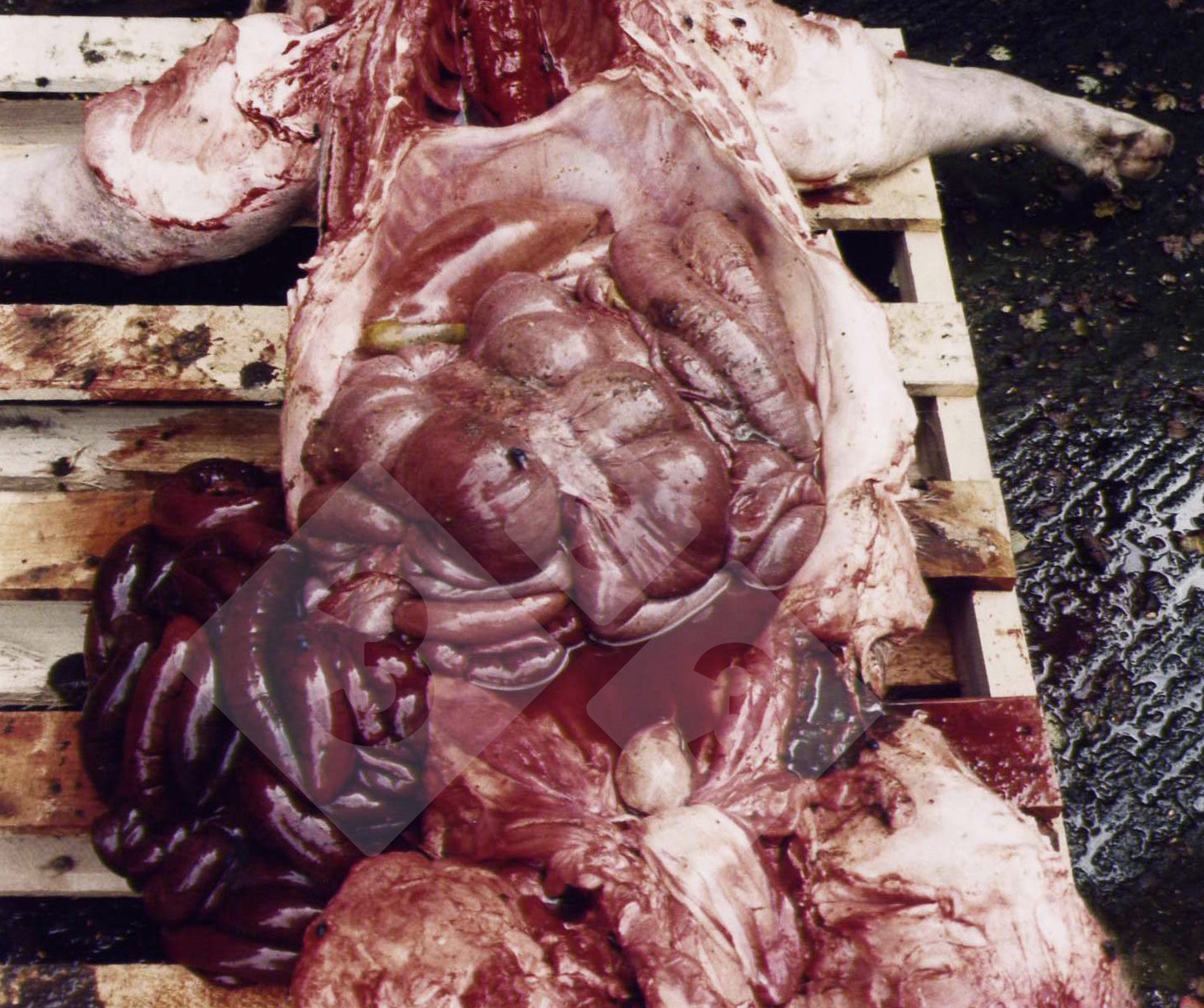 Este cerdo murió por una torsión intestinal, que suele ser una causa esporádica de muerte. Las bajas en destete y engorde deberían estar por debajo del 3% y hasta un tercio de ellas pueden ser causadas por torsión. Si alcanzan o superan el 1% deben analizarse cuidadosamente los componentes de la dieta para ver si hay ingredientes a base de almidón que puedan causar una fermentación intestinal excesiva. En estos casos, la adición de un antibiótico y/o un aumento del nivel de fibra en la dieta reducirá la multiplicación bacteriana que produce gas intestinal y, finalmente, la torsión.