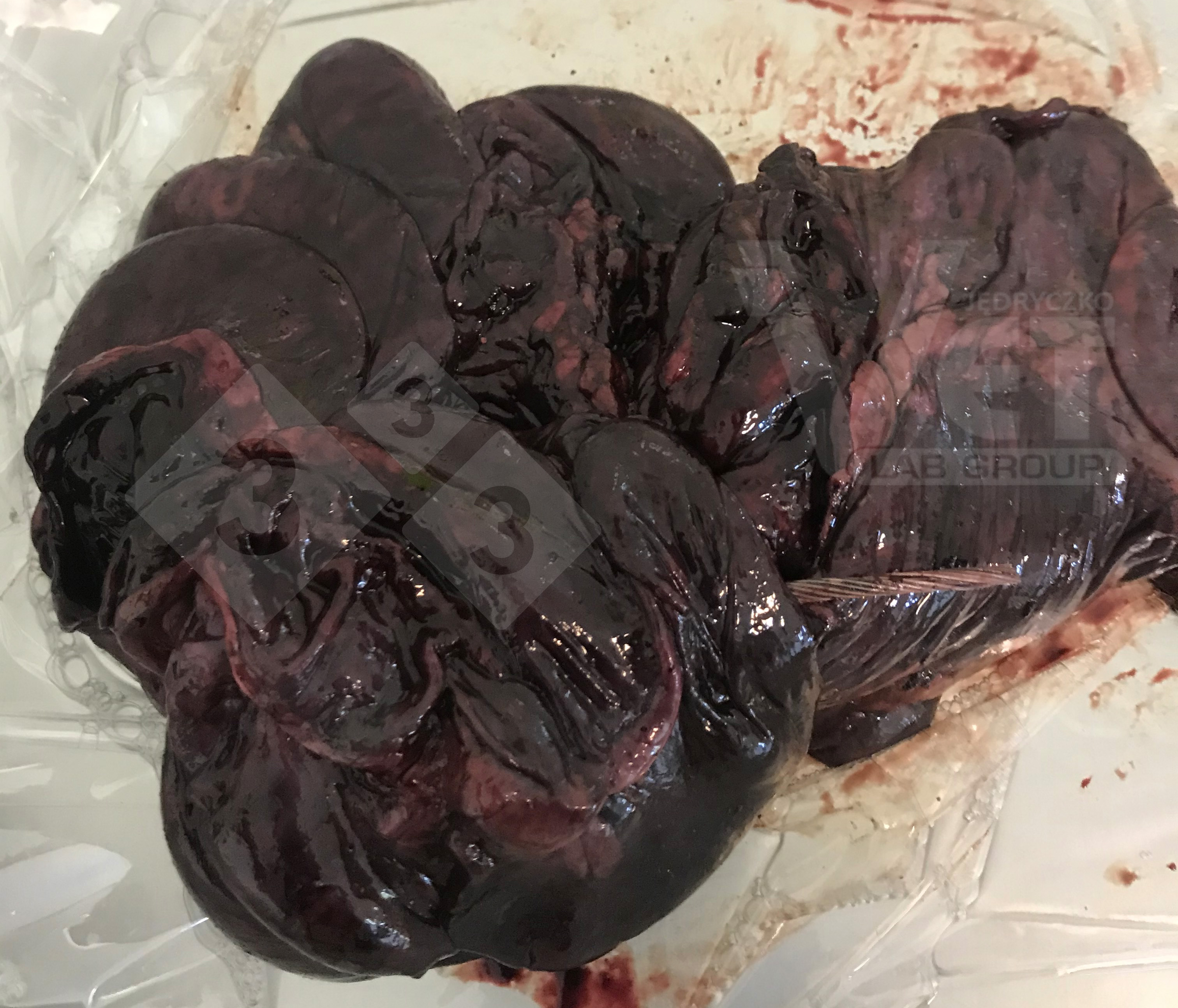 Estos cambios inflamatorios en el intestino de un cerdo de engorde fueron causados por Lawsonia intracellularis. Los cambios más típicos comienzan en el íleon, luego en el yeyuno, ciego y colon. Las secciones intestinales alteradas están dilatadas y distendidas, la submucosa está inflamada, a veces con petequias. Dentro de los intestinos, se pueden encontrar coágulos de fibrina o sangre fresca. En este caso grave con importantes cambios hemorrágicos, se realizó el diagnóstico con PCR para la detección de Lawsonia intracellularis. La PCR para la detección de Brachyspira hyodysenteriae fue negativa.