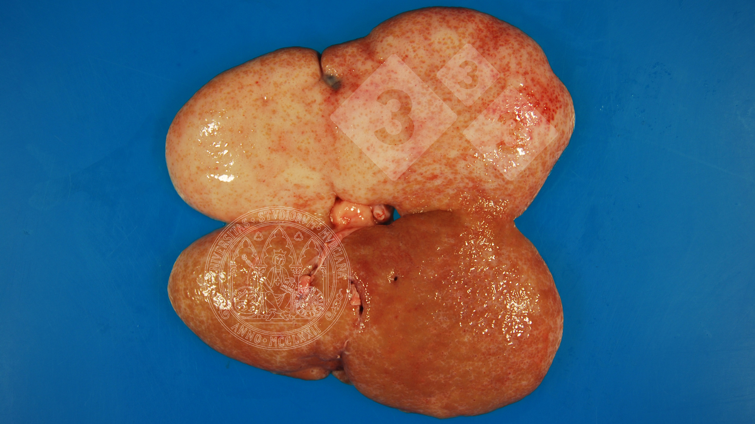 Riñón abierto de un cerdo de cebo que aparece con una coloración blanquecina en gran parte de la superficie y unos contornos irregulares. Se trata de un proceso crónico de fibrosis (esclerosis) como evolución de una nefritis intersticial y clínicamente se asocia a insuficiencia renal crónica.