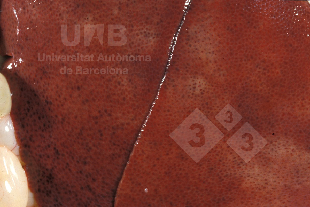 La hepatosis dietética está causada por la deficiencia de Vitamina E y Selenio. Esto causa una severa necrosis de los hepatocitos centrilobulillares, que son reemplazados por hemorragias.