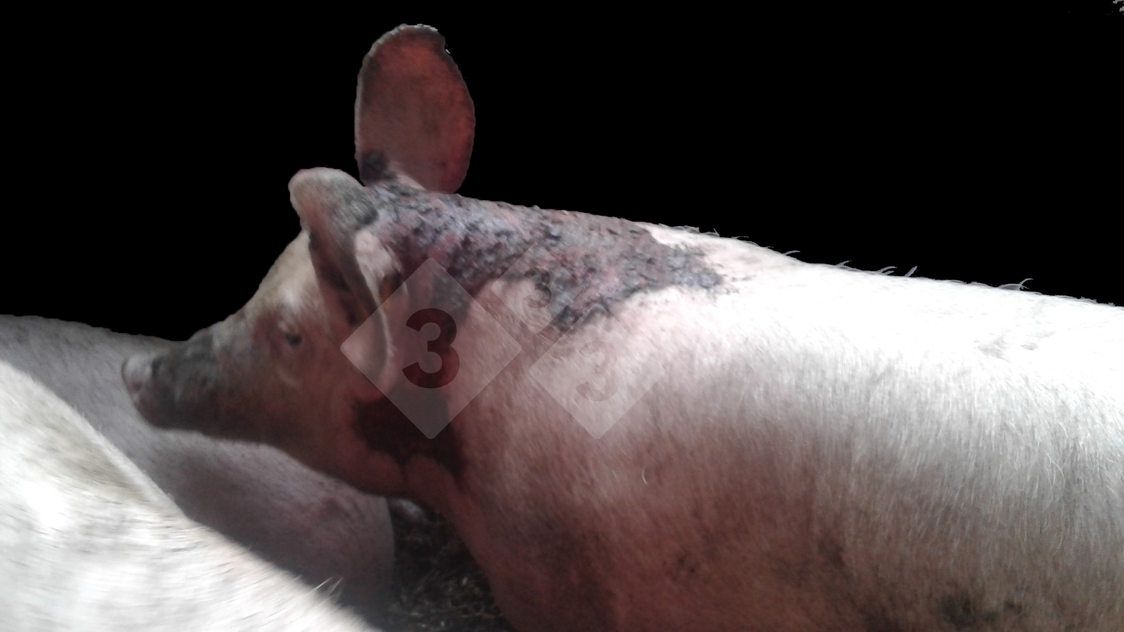 La piel del cuello de este cerdo de engorde tenía una herida producida por un fragmento afilado de la chapa de la separación de los corrales.Los cerdos han destruido este equipo mal asegurado, doblando una parte afilada. En la foto se ve la sangre seca y sucia.