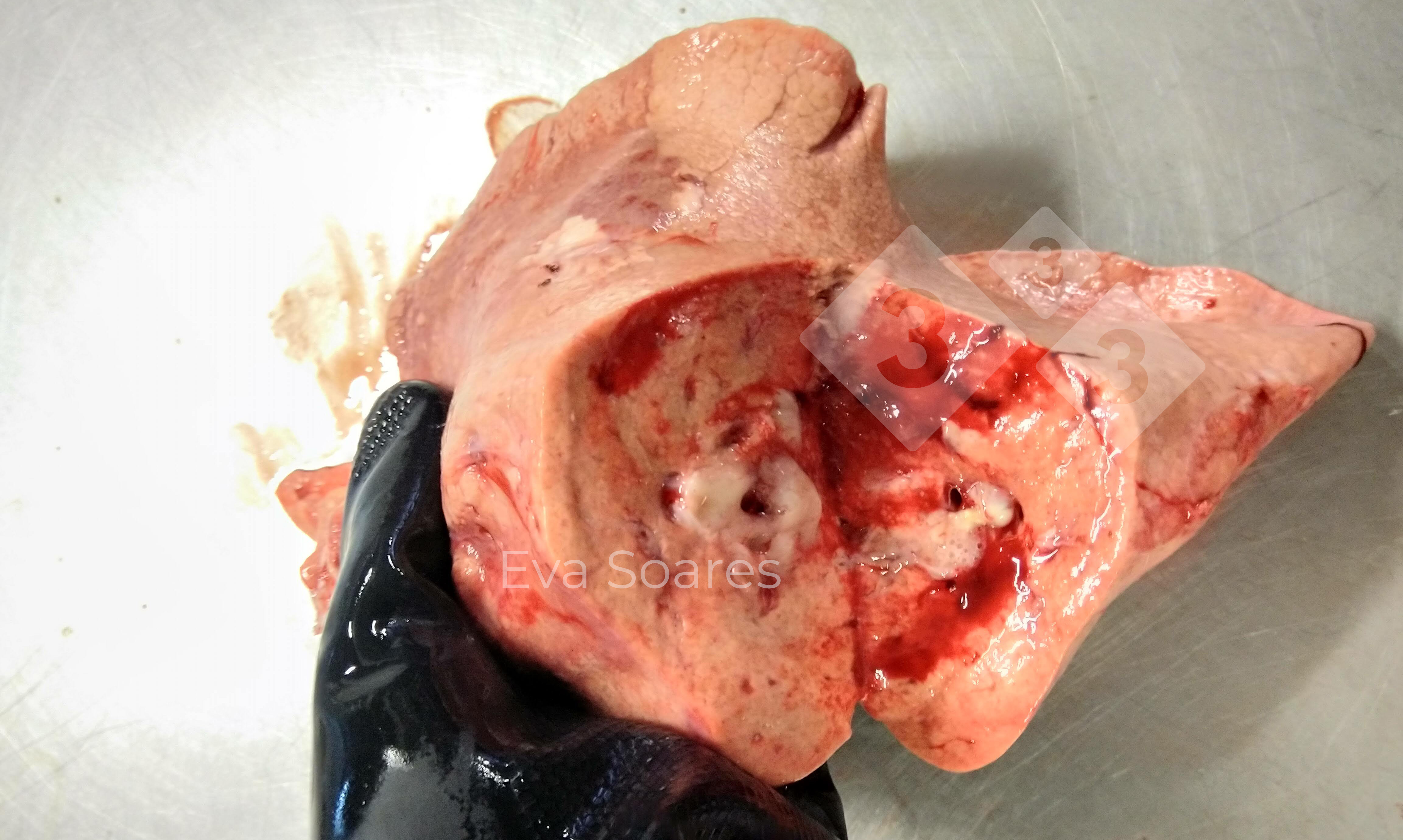 Pulmón de un cerdo de engorde encontrado en el matadero con hipertrofia debida a un enfisema alveolar que se formó durante el proceso de escaldado. El uso de escaldado horizontal en los mataderos de cerdos significa que los animales están sumergidos, con la posibilidad de aspiración de agua (debido al mal aturdimiento o a los últimos movimientos involuntarios del animal). Los bronquios y los bronquiolos están llenos de espuma mezclada con fluidos, que puede contener cerdas y restos de piel, lo que permite distinguirlos del edema pulmonar.