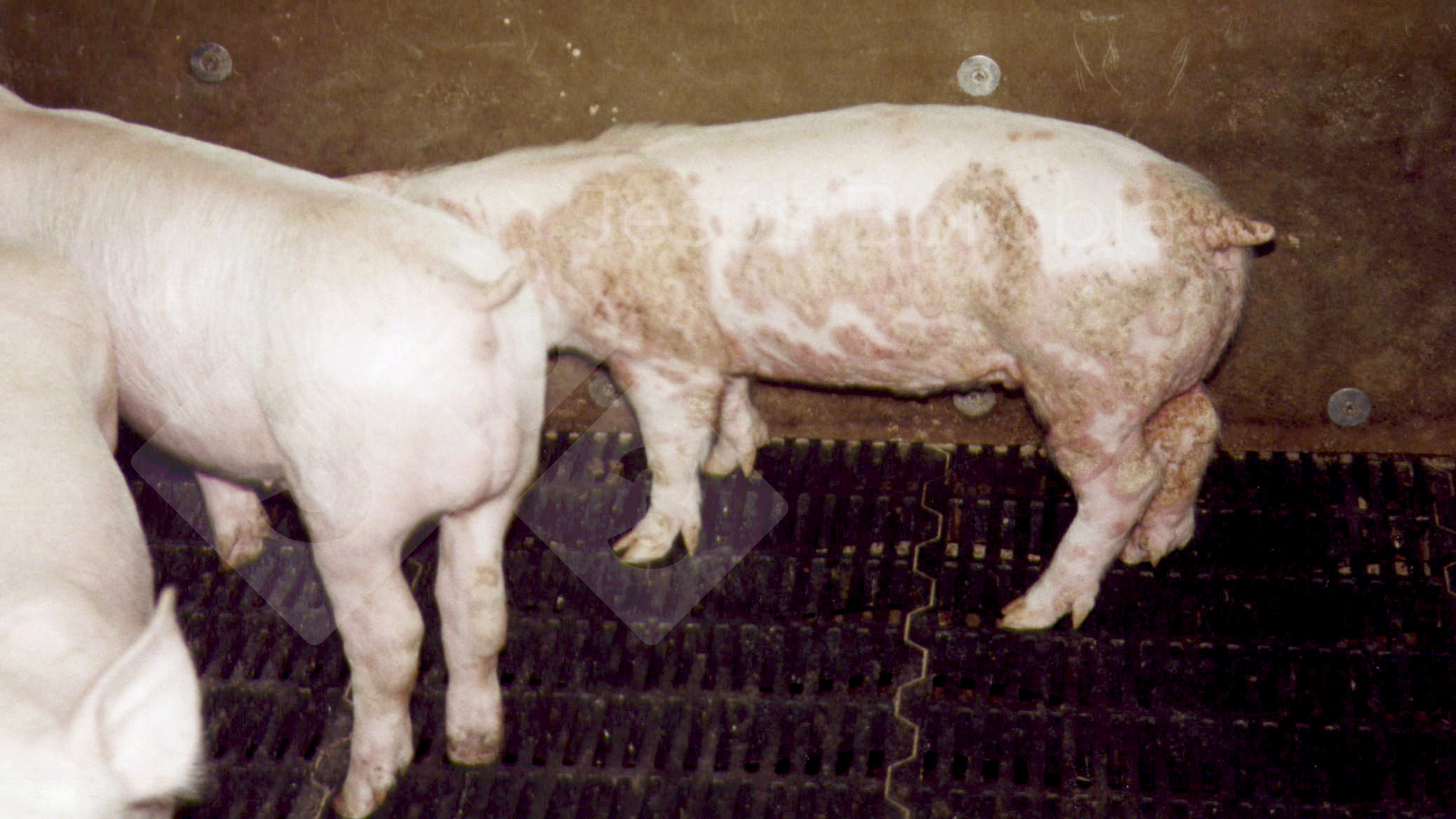 Grandes lesiones coalescentes similares a la tiña localizadas en abdomen y patas delanteras y traseras. Se trata de pitiriasis rosada, una condición esporádica observada en cerdos jóvenes de 3 a 16 semanas de edad. Se cree que tiene un componente hereditario.
