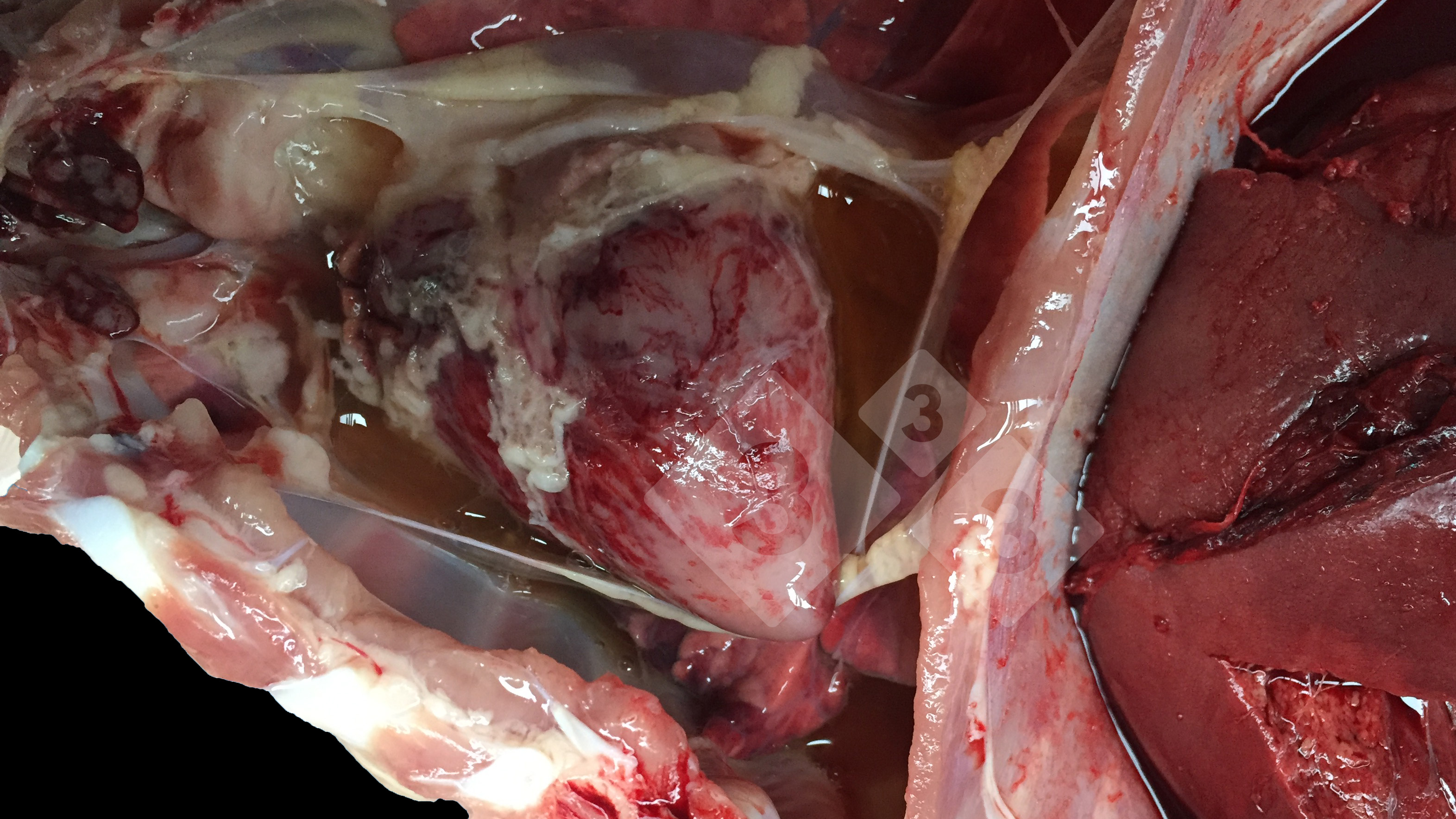 Líneas pálidas y zonas necróticas en el miocardio y rotura hepática - Atlas de patología
