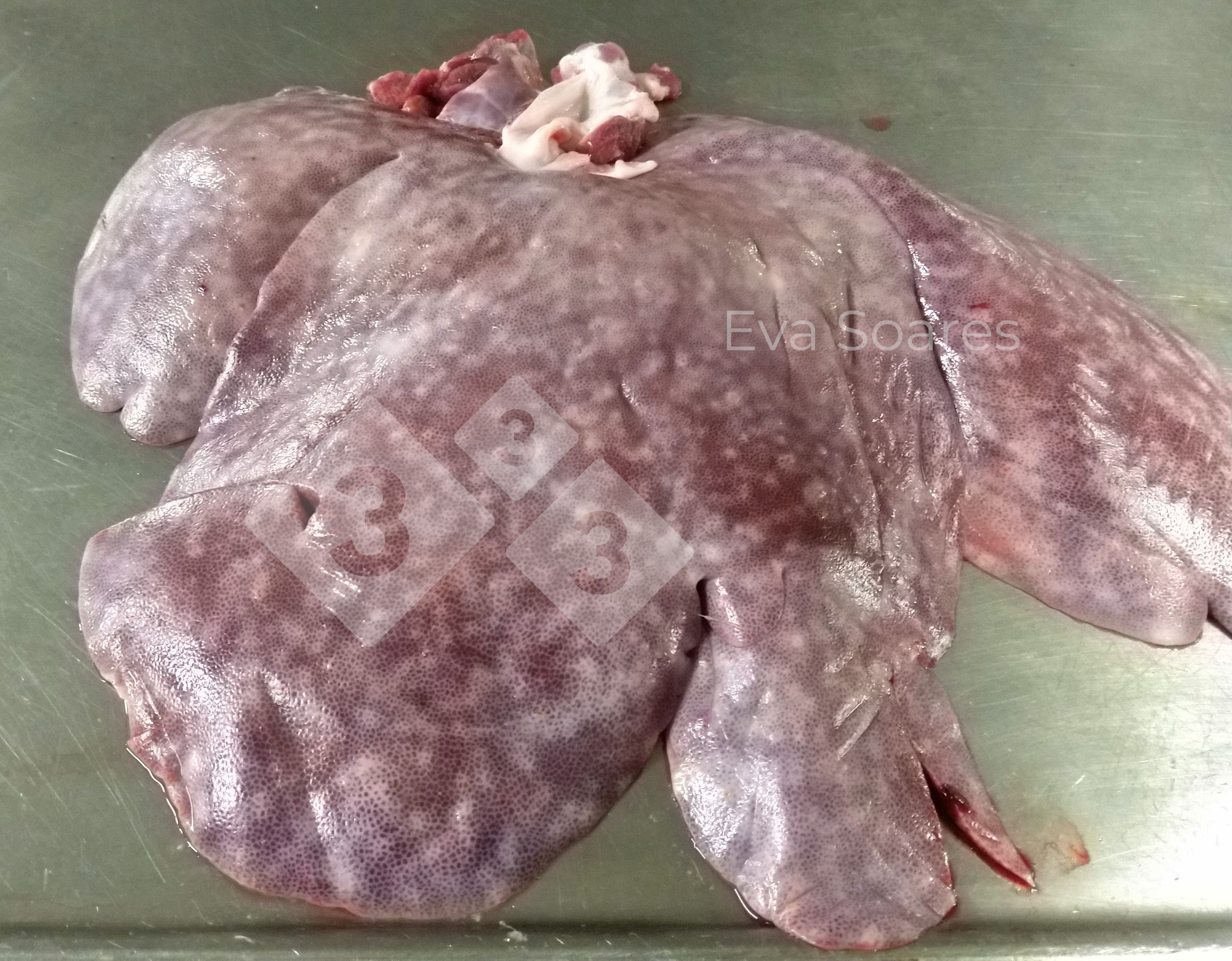 Lesiones encontradas en un cerdo de engorde en el matadero. Estas lesiones, también conocidas como "manchas de leche", resultan de la migración de larvas de Ascaris suum que, por acción irritativa, dan origen a brotes de hepatitis intersticial crónica. Inicialmente estas lesiones son hemorrágicas, más tarde se vuelven bien definidas y de color blanco, apareciendo tanto en el interior como en la superficie del hígado.