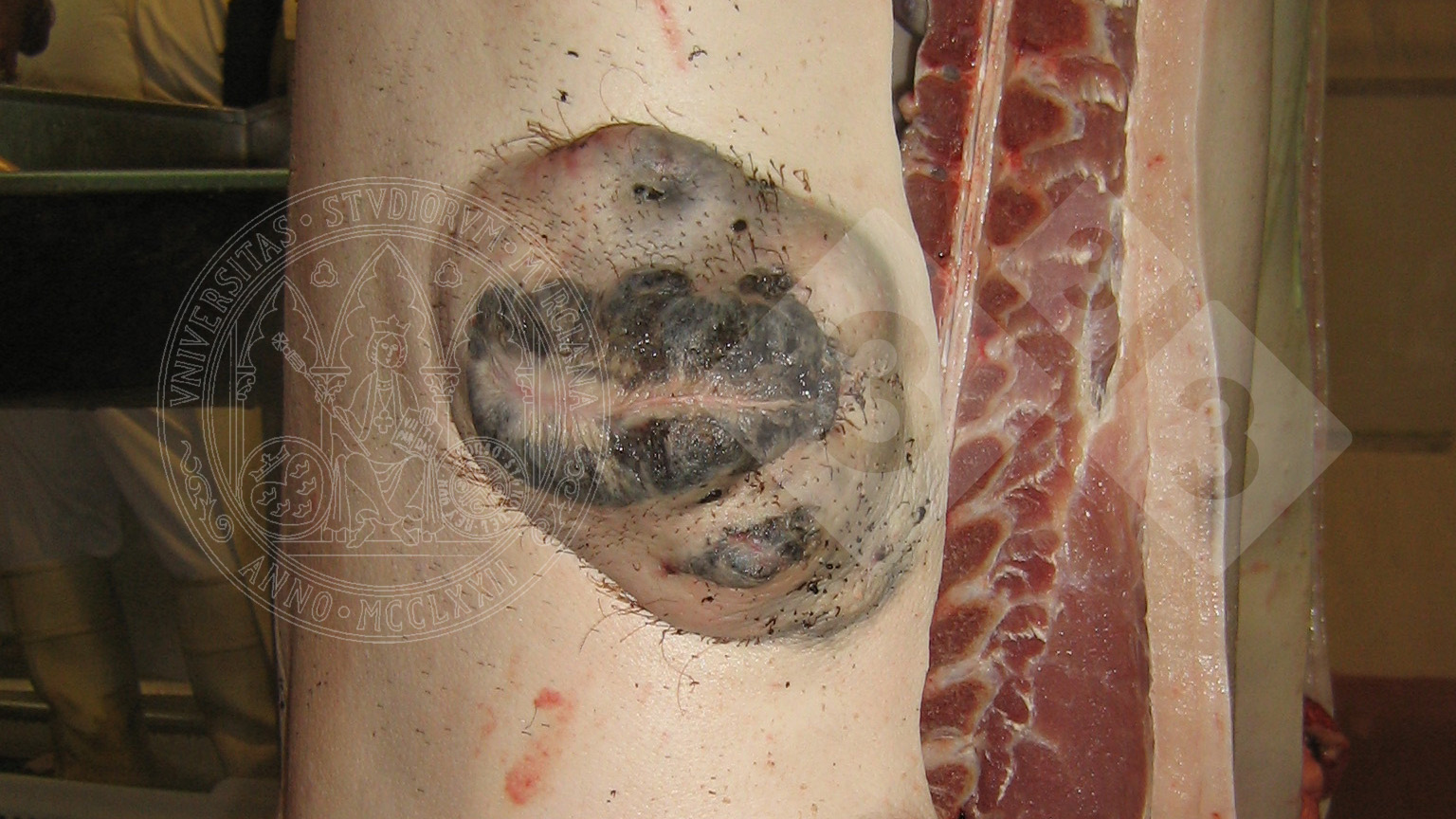 Cerdo de matadero que presenta áreas sobreelevadas en el costado izquierdo con zonas de coloración negruzca en su interior. A nivel microscópico se observan grupos de células con pigmento de color marrón-negruzco que se decolora cuando se aplica peróxido de hidrógeno. Se trata de un melanoma cutáneo.