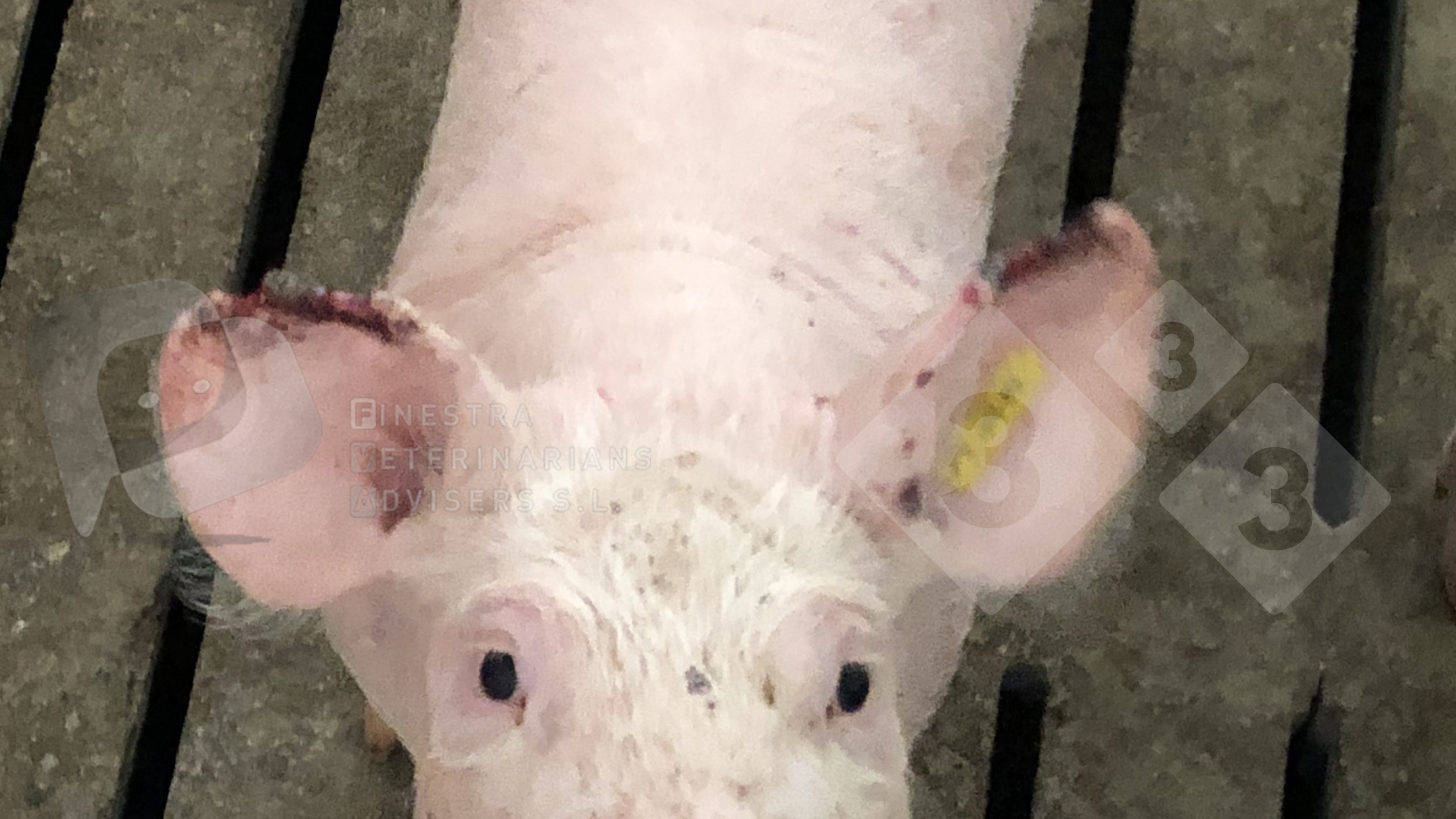 Necrosis bilateral de la punta de las orejas. La aparición de este proceso, bilateral o unilateral, es frecuente. Se presenta de forma aguda, iniciándose con casos esporádicos, para continuar aumentando hasta generalizarse a varios corrales y a la mayoría de animales en los corrales afectados en unos pocos días.