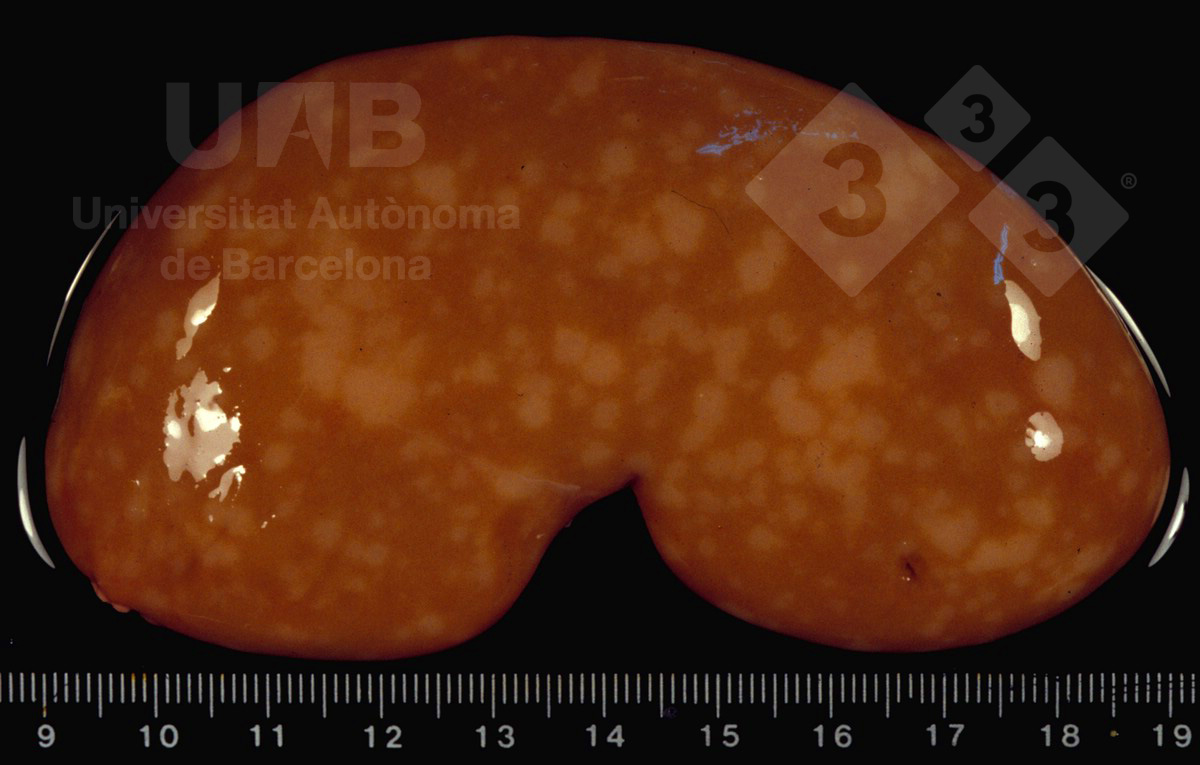 La nefritis intersticial multifocal, también conocida como "riñón de manchas blancas", corresponde a una inflamación crónica y no supurativa del intersticio renal. La causa suele ser desconocida, aunque en algunos casos ha sido asociado a leptospirosis y circovirus porcino tipo 2.