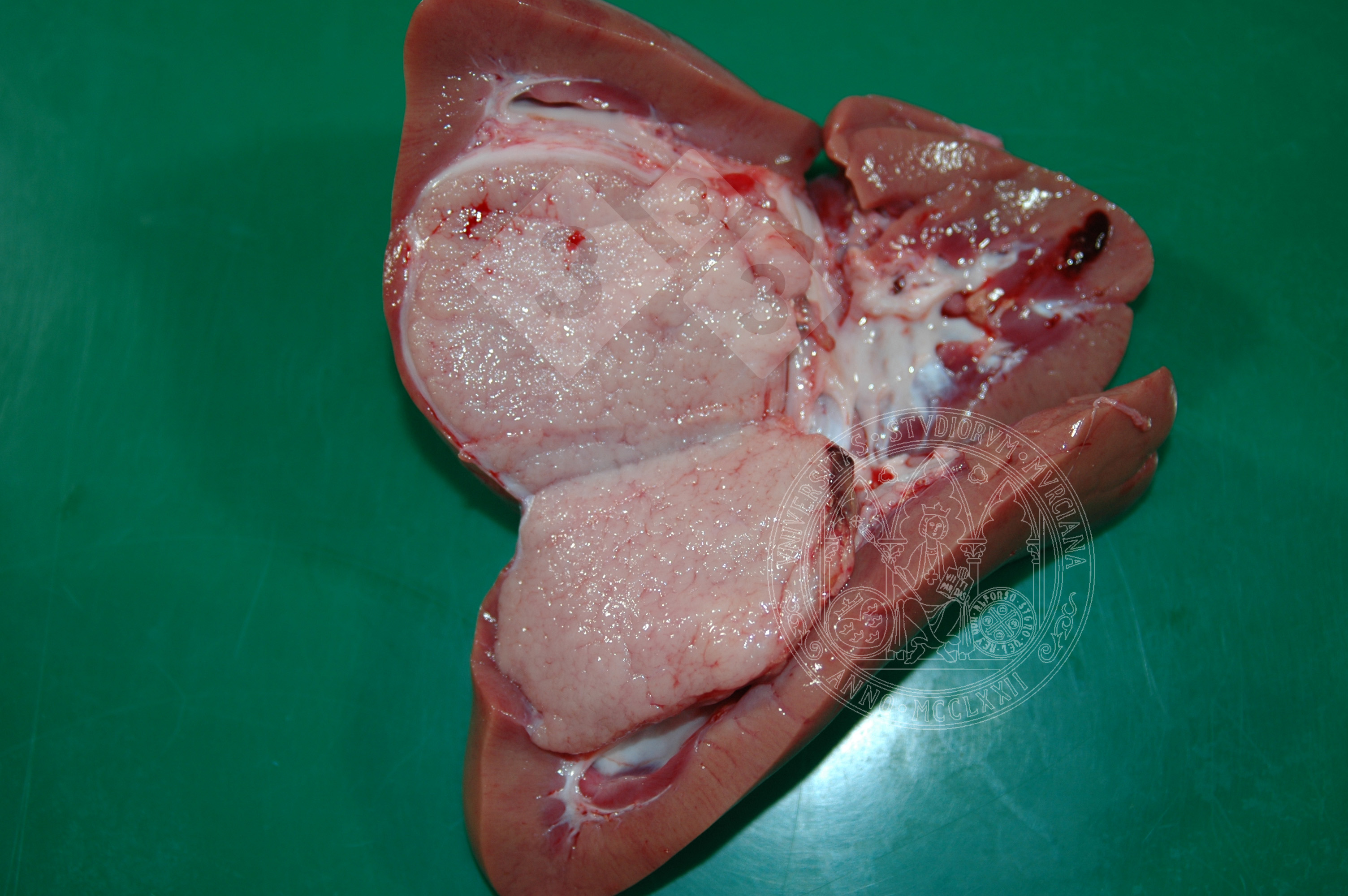 Se observa una masa redondeada de color blanquecino en el riñón que al corte tiene un aspecto lardáceo. Se trata de un tumor de origen embrionario denominado nefroblastoma. Es el tumor renal primario más común en los cerdos. Suelen ser unilaterales, aunque a veces pueden ser bilaterales y en algunos casos pueden dar metástasis a otros órganos como pulmón e hígado.