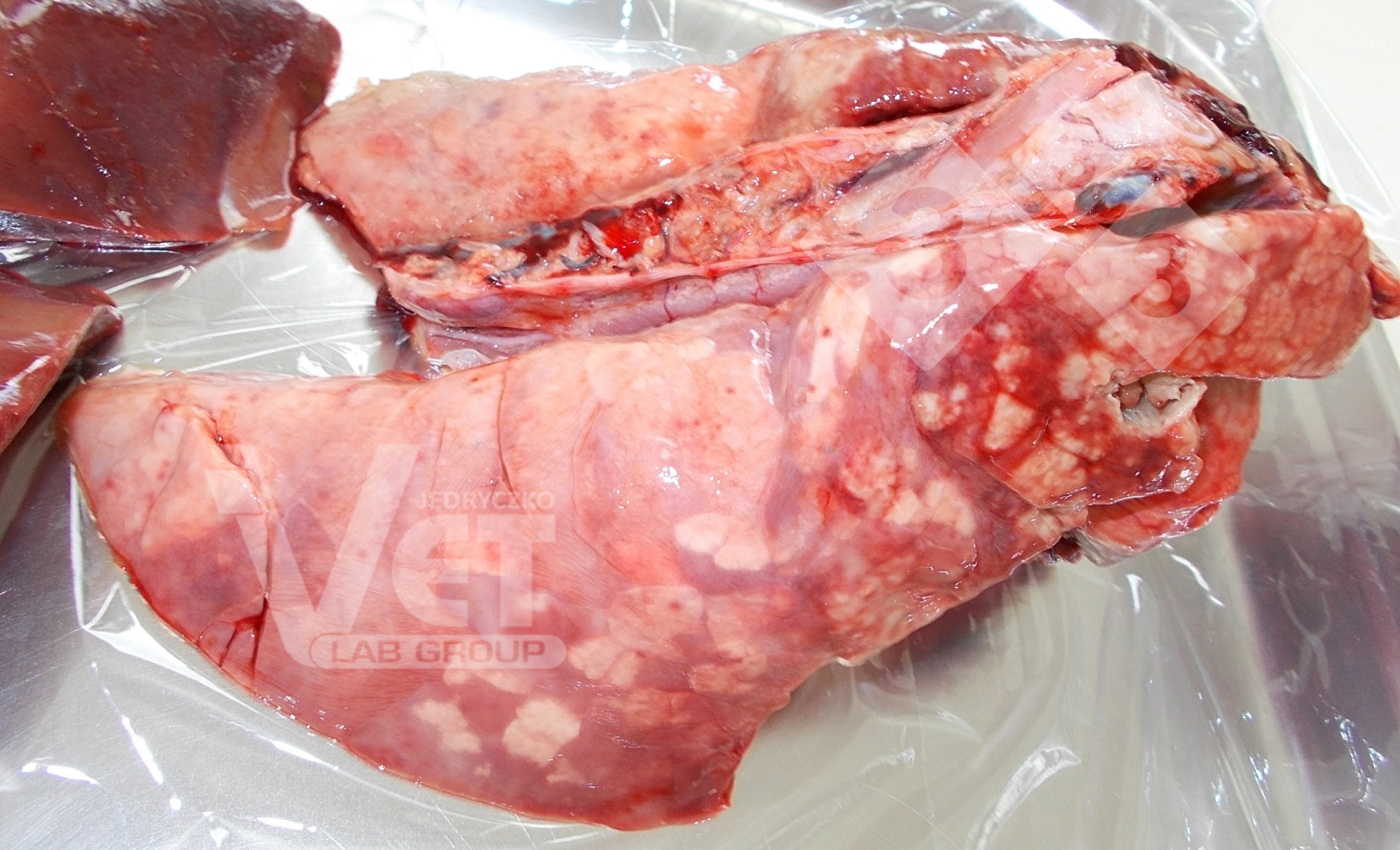 Estos pulmones presentan cambios inflamatorios que, en este caso, fueron causados por el PRRSv. Los síntomas respiratorios, especialmente la dificultad respiratoria, se observan principalmente en cerdos en la primera y segunda fase de engorde. Pueden ir acompañados por anorexia, somnolencia, fiebre, conjuntivitis, edema palpebral y decoloración de nariz y orejas. La infección pulmonar por PRRSv aumenta el riesgo de infecciones secundarias (p.e. Pasteurella multocida, Trueperella pyogenes, Streptococcus suis). En una granja, la enfermedad puede aumentar las pérdidas y el crecimiento desigual de los grupos de engorde.