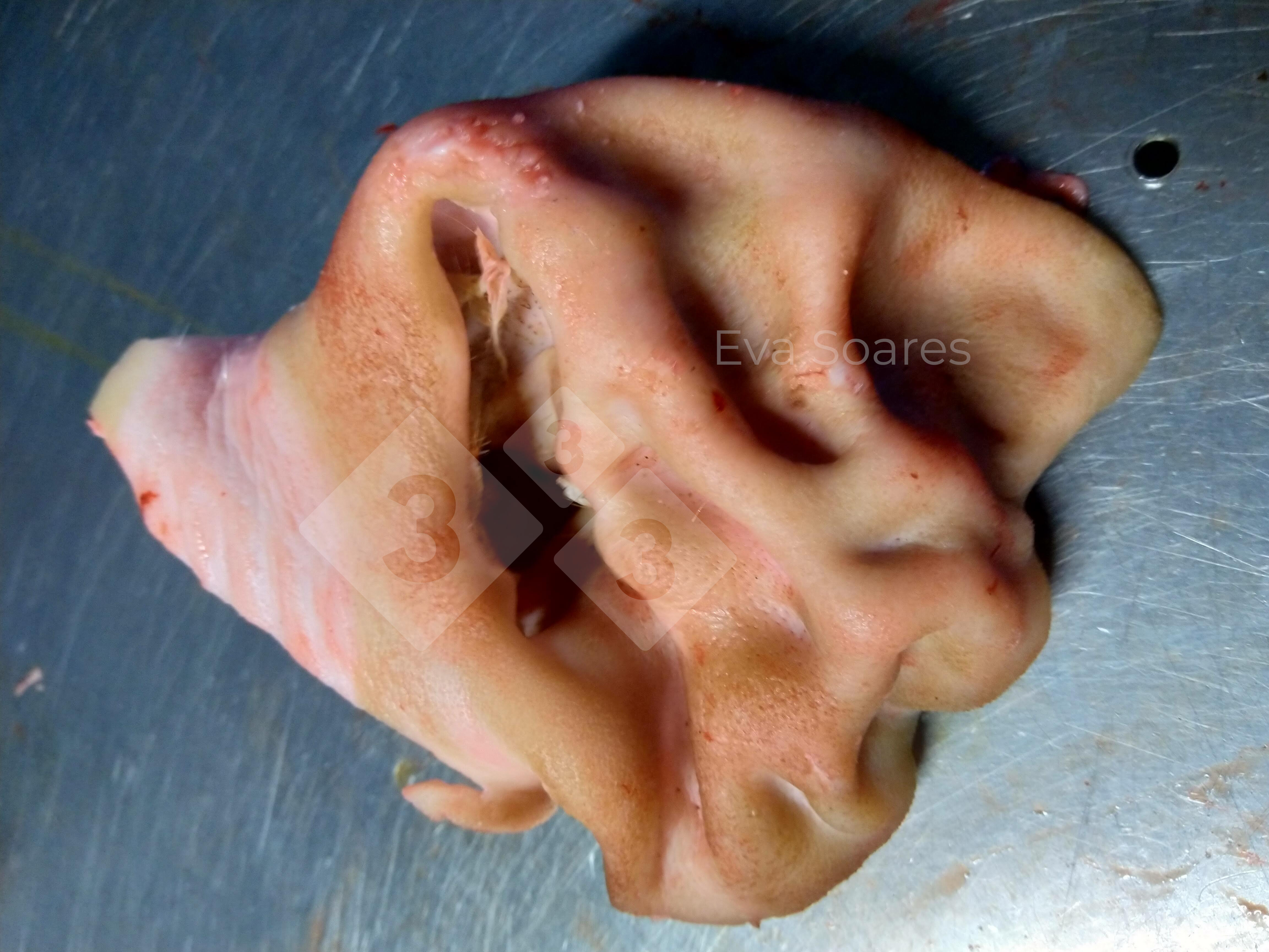 Oreja deformada como consecuencia de un hematoma, encontrada en un cerdo de engorde en el matadero. Los hematomas auriculares son consecuencia de traumatismos debidos a mordeduras de las orejas, sacudidas violentas de la cabeza por un prurito intenso (por ejemplo ácaros) o por agarrar a los cerdos por las orejas.