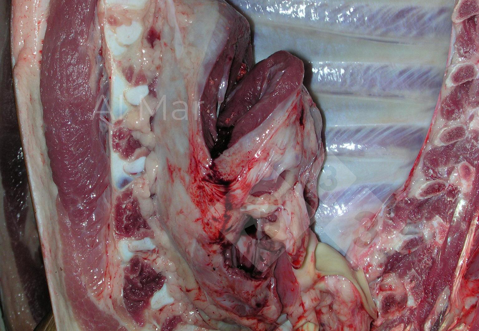 La lesión encontrada en la cavidad torácica de un cerdo tras el sacrificio es una pericarditis con pleuritis fibrosa crónica, es decir, se observan adherencias de corazón y pericadio y de éste con la pleura.