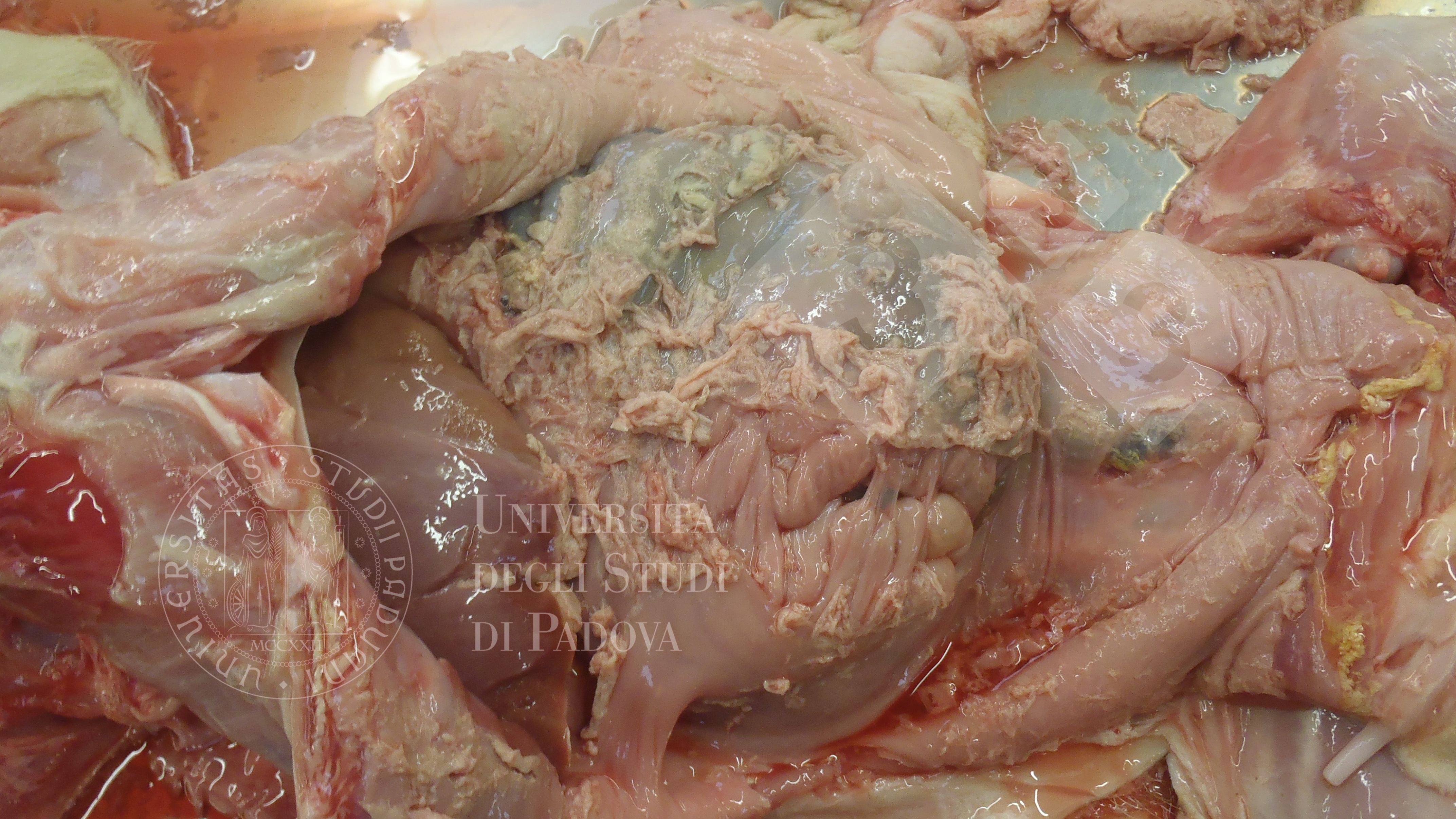Los órganos peritoneales están cubiertos por un exudado fibrinosos amarillento, difuso, severo y bien organizado. Esta peritonitis crónica, severa y difusa puede verse sólo en el abdomen o en otras cavidades serosas (pericardio y pleura). Estos hallazgos son consistentes con con la enfermedad de Glässer (poliserositis) causada por Haemophilus parasuis. Esta enfermedad ocasionalmente puede afectar también a las articulaciones y al sistema nervioso central.