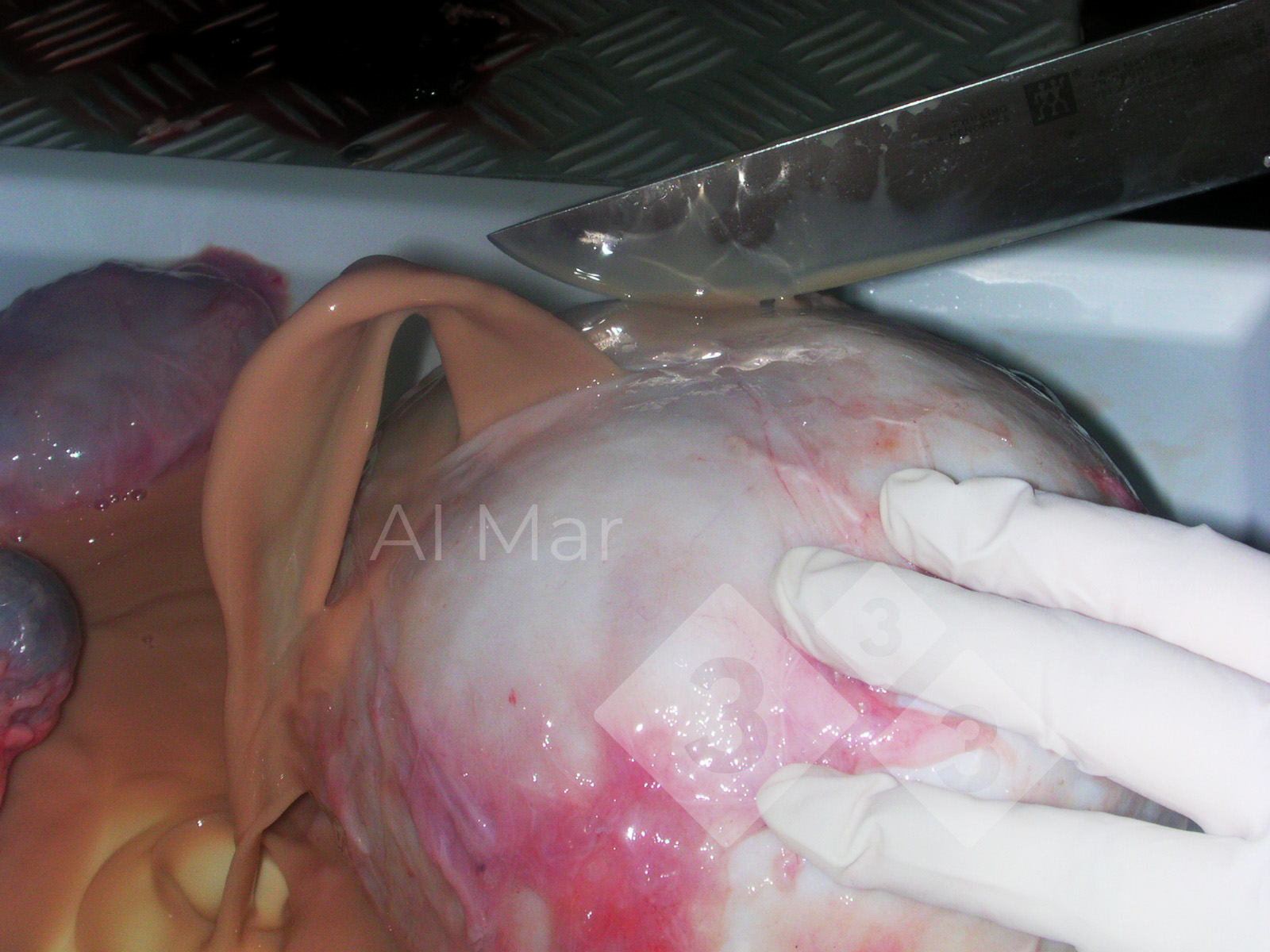 En este caso se encontraron varios quistes de distintos tamaños entre 5 y 15 cm de diámetro distribuidos por el espacio mesentérico de intestino delgado, con paredes bien definidas en los que al realizar un corte salia el líquido muy fluido. La causa más frecuente parece ser una obstrucción de conductos linfáticos aunque puede deberse a infecciones o procesos hemorrágicos.