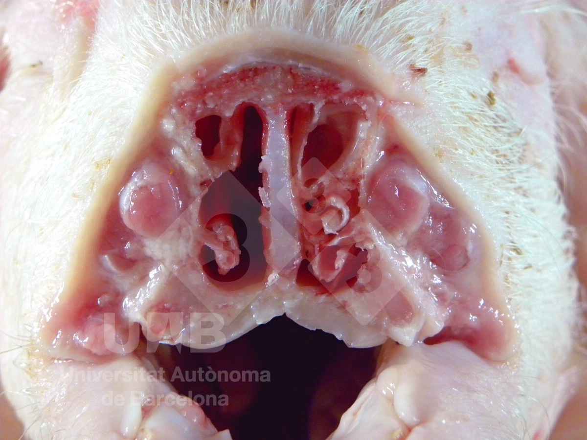Esta lesión corresponde a la patología conocida como rinitis atrófica. Está producida por Bordetella bronchiseptica (rinitis atrófica no progresiva, RAnP) y/o Pasteurella multocida (rinitis atrófica progresiva, RAP) tipo D o, más raramente, tipo A. La RAnP suele producir unos signos clínicos leves, en cambio, RAP produce graves pérdidas productivas.
