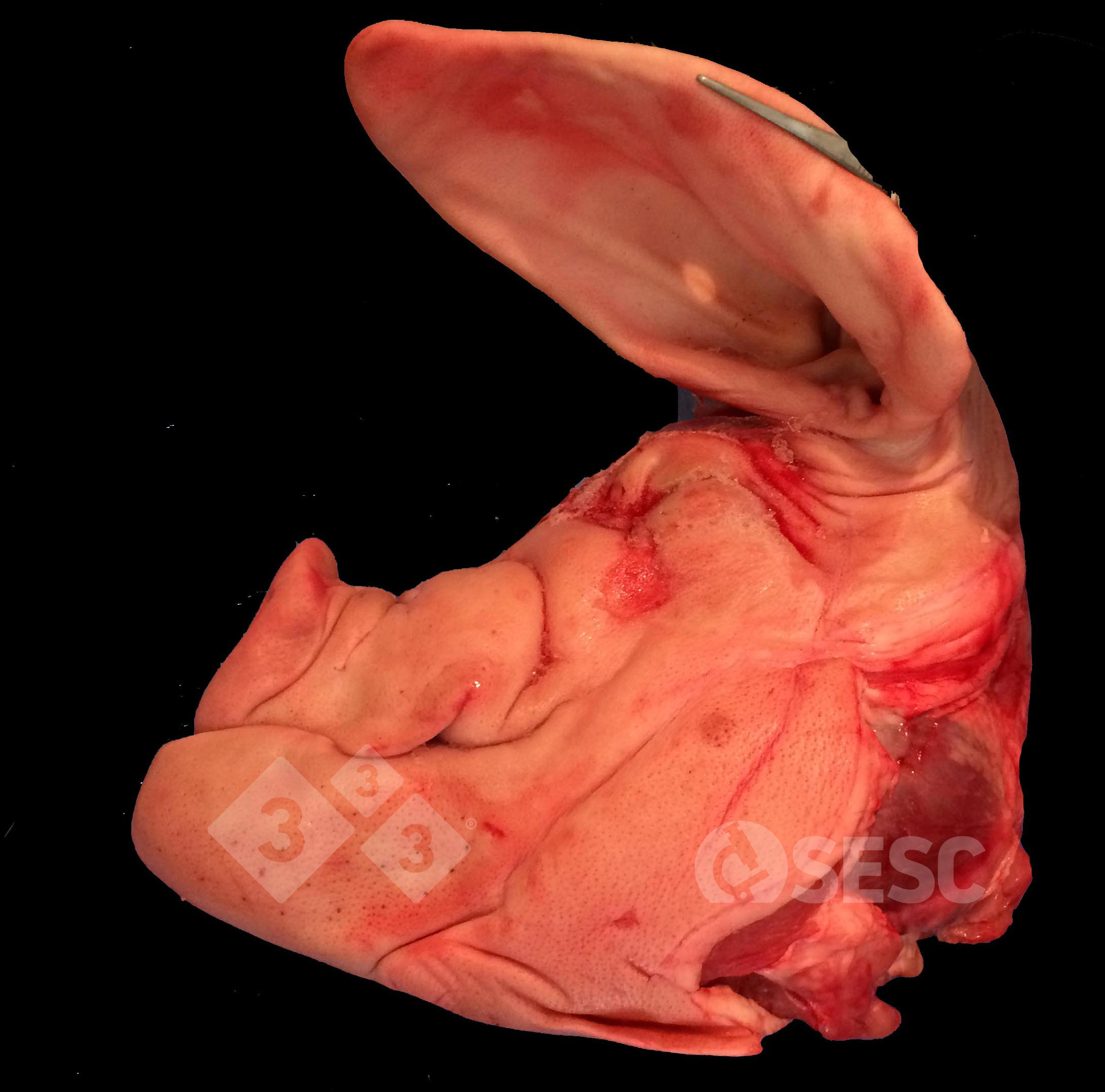 En esta cabeza de cerdo puede observarse un acortamiento del hueso maxilar (braquignatia superior) secundario a una atrofia y desviación de los turbinados nasales. Esta enfermedad se llama rinitis atrófica, una patología multifactorial causada tanto por la dermonecrotoxina de Pasteurella multocida (rinitis atrófica progresiva) como de Bordetella bronchiseptica (rinitis atrófica no progresiva). La mala calidad del aire es un factor predisponente.