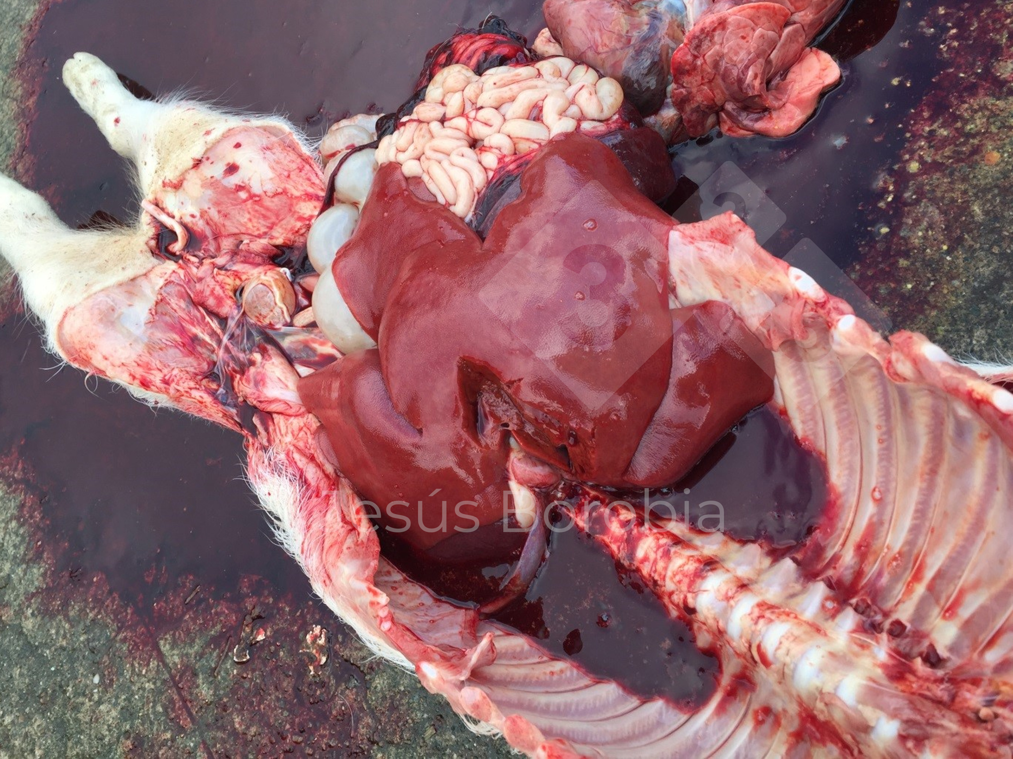 Varios cerdos de engorde de 6-8 murieron repentinamente. Las canales estaban pálidas (anémicas) y la necropsia reveló fluido hemorrágico en el abdomen, con hilos de sangre coagulada. Había rotura hepática y un exceso de fluido en el tórax. El corazón y los músculos también estaban pálidos.