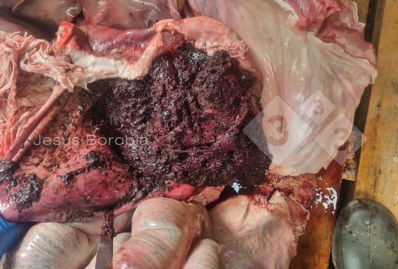 Estómago lleno de sangre digerida derivada de una úlcera gástrica en la pars esofágica en una cerda que fue encontrada muerta en el corral. Se trata de un hallazgo esporádico en la granja.