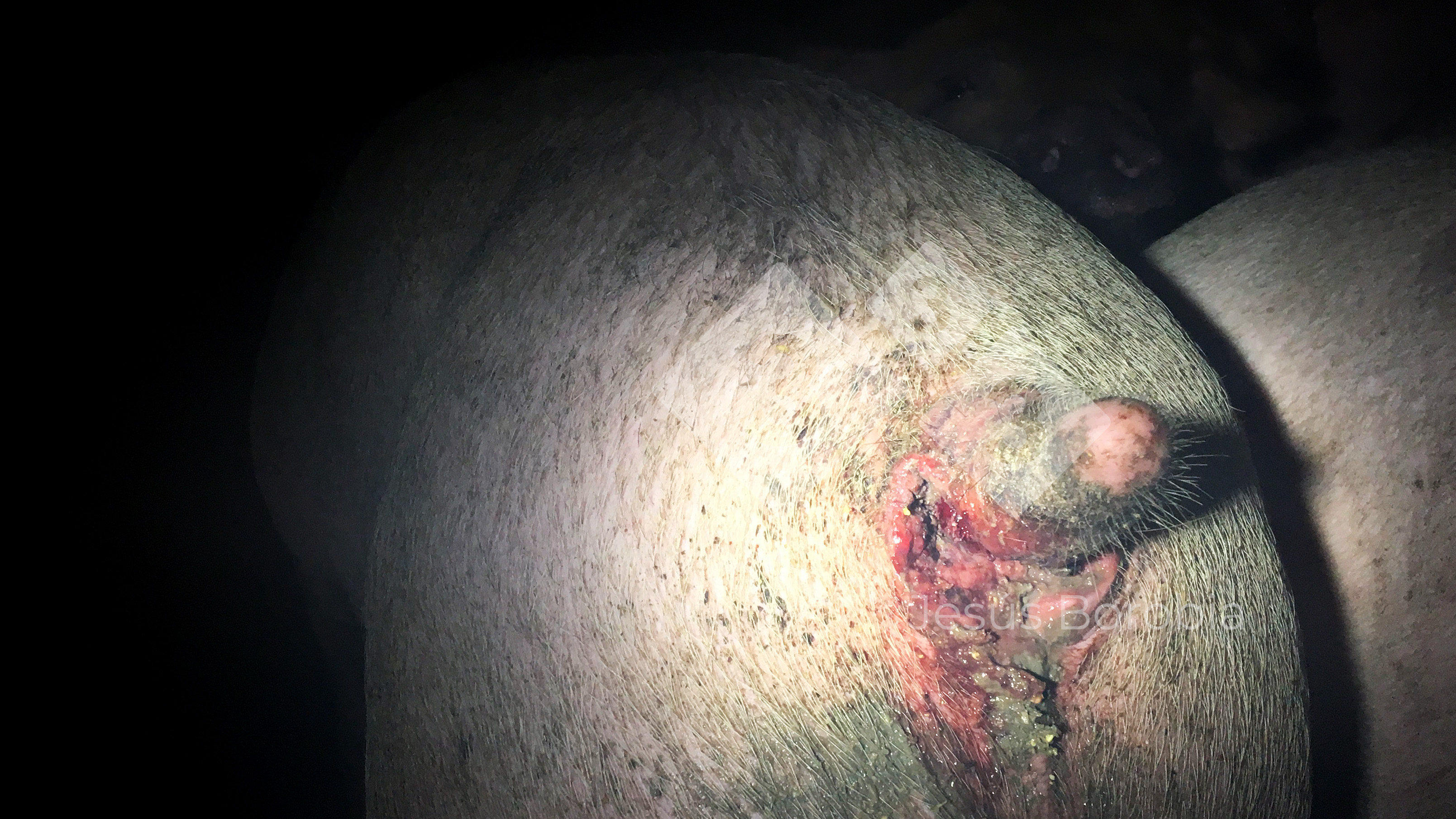 Las mordeduras anales en cerdos de engorde no son muy frecuentes, aunque son muy dañinas, que se normalmente se considera, junto con las mordeduras de cola, flancos y orejas, un vicio. Igual que estas otras formas de comportamiento aberrante, las causas a menudo son múltiples y complejas y pueden ser particularmente difíciles de controlar.