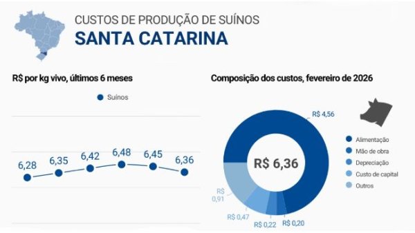 O Cepea observa que as especulações geradas em torno do cenário geopolítico têm limitado a liquidez no mercado independente, levando produtores e indústrias a evitarem ajustes nos preços de comercialização do suíno vivo e da carne