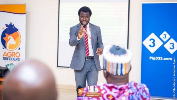 Olasupo Solomon Ayobami, gerente de marca da 333 Africa, apresentou o pig333.com aos produtores de suínos em Abuja, na Nigéria. Este é o primeiro passo da 333 para se aproximar do mercado africano.