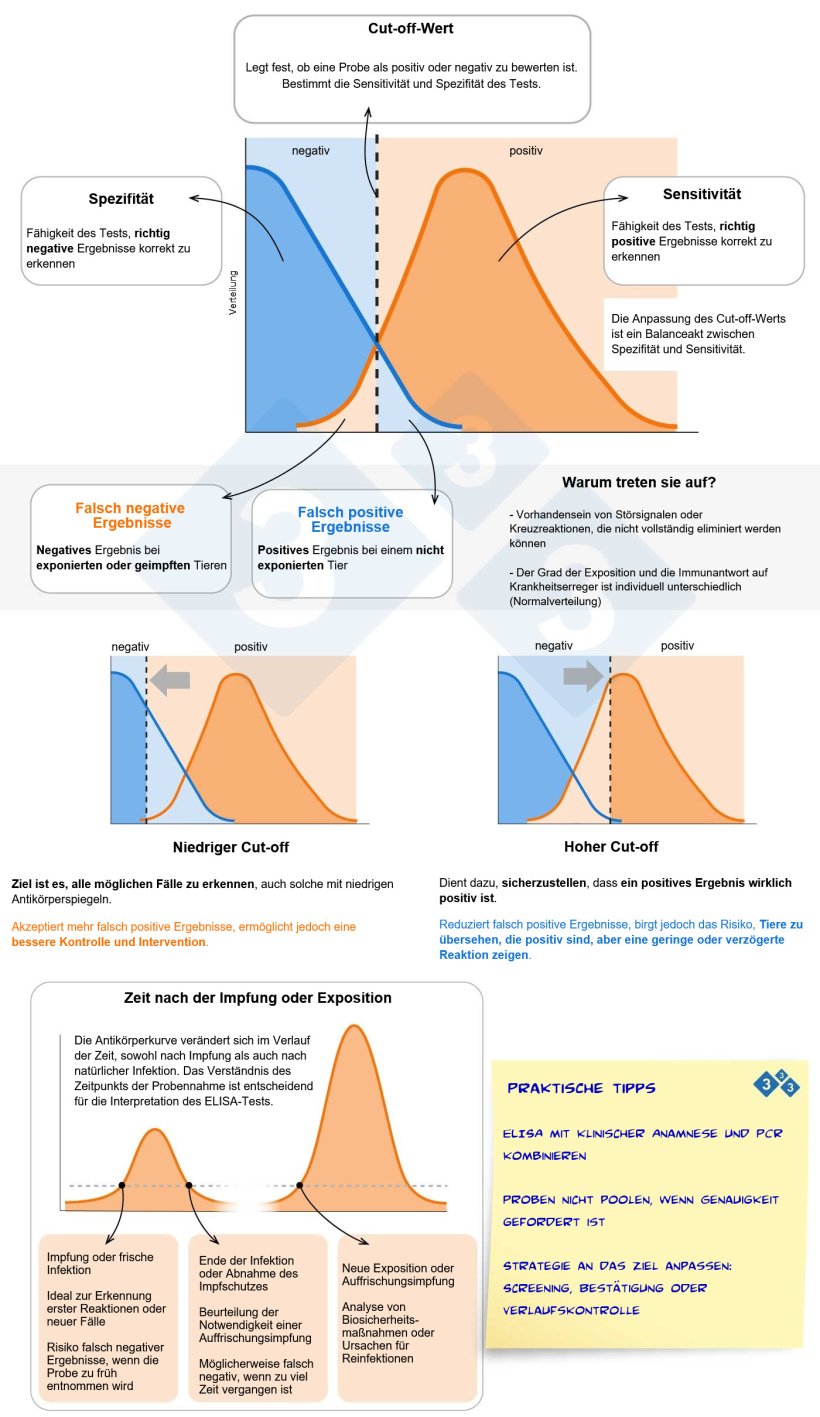 Der Cut-off-Wert in ELISA-Tests hat direkten Einfluss auf die Sensitivität und Spezifität der Diagnose. Die Festlegung eines höheren oder niedrigeren Cut-off-Werts erfordert eine sorgfältige Abwägung, da dieser Parameter die Erkennung positiver oder negativer Tiere direkt beeinflusst und somit Konsequenzen für Diagnosen, Überwachungsstrategien und Biosicherheitsmaßnahmen hat.