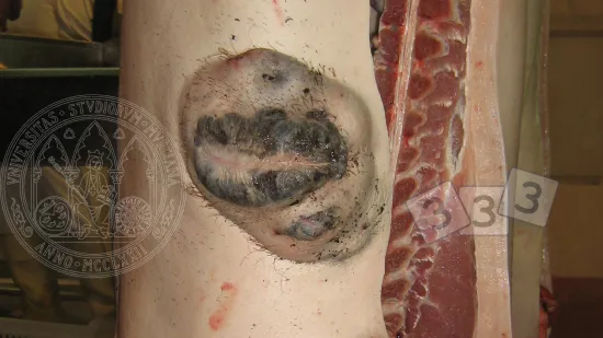 Flecken auf der Haut eines Mastschweins, festgestellt am Schlachthof. Was ist die wahrscheinlichste Ursache für diese Läsion?