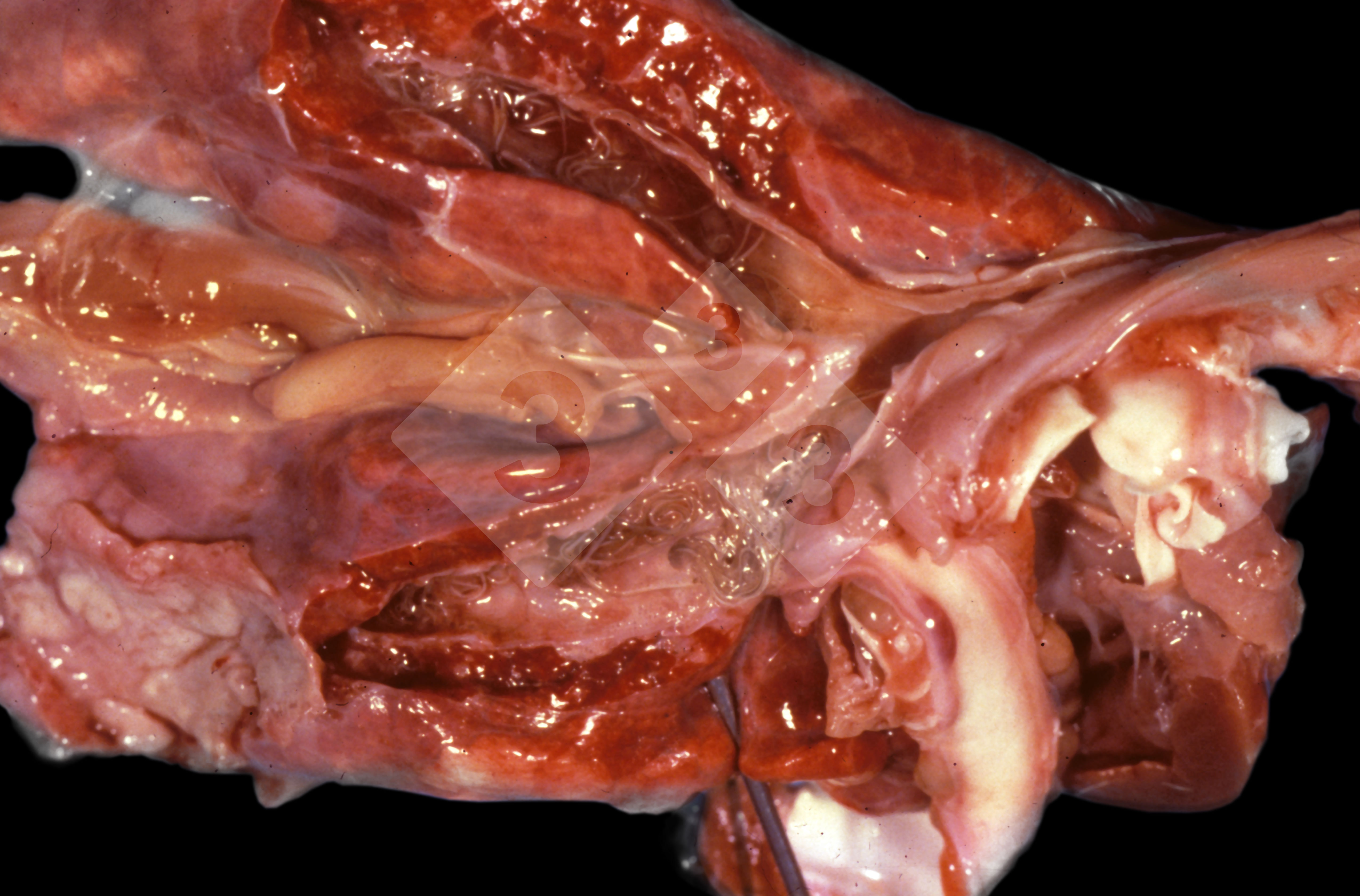 This is parasitic bronchopneumonia due to the specific lungworm of the pig, named Metastrongylus apri. These worms live in the bronchi and bronchioles of the pig lungs. Affected pigs may have poor body condition, with a deep chronic cough and difficulty breathing. At autopsy, the lungs and bronchial airway tree contain numerous 2 to 6 cm long thread-like worms inside the airways. The lung lobes may have moderate pneumonia, with dark purple consolidation, noticed at the outer edges of lobes. These adult M apri worms and their eggs and larvae produce an inflammation and irritant effect in the airways of the lungs, leading to a persistent cough. The life cycle of this worm is indirect, wherein the completion of the life cycle requires the intervention of earthworms on the ground. The life cycle is completed by pigs eating an earthworm that contains infective larvae inside it. Infection therefore only occurs where pigs have access to earthworms, for example in outdoor farms with open ground or orchards. This disease is still common in some areas where pigs kept outdoors. This is because the earthworm populations will retain the worms for long periods and pigs moving around on outdoor pastures are attracted by earthworms and will dig around trying to find them and eat them.