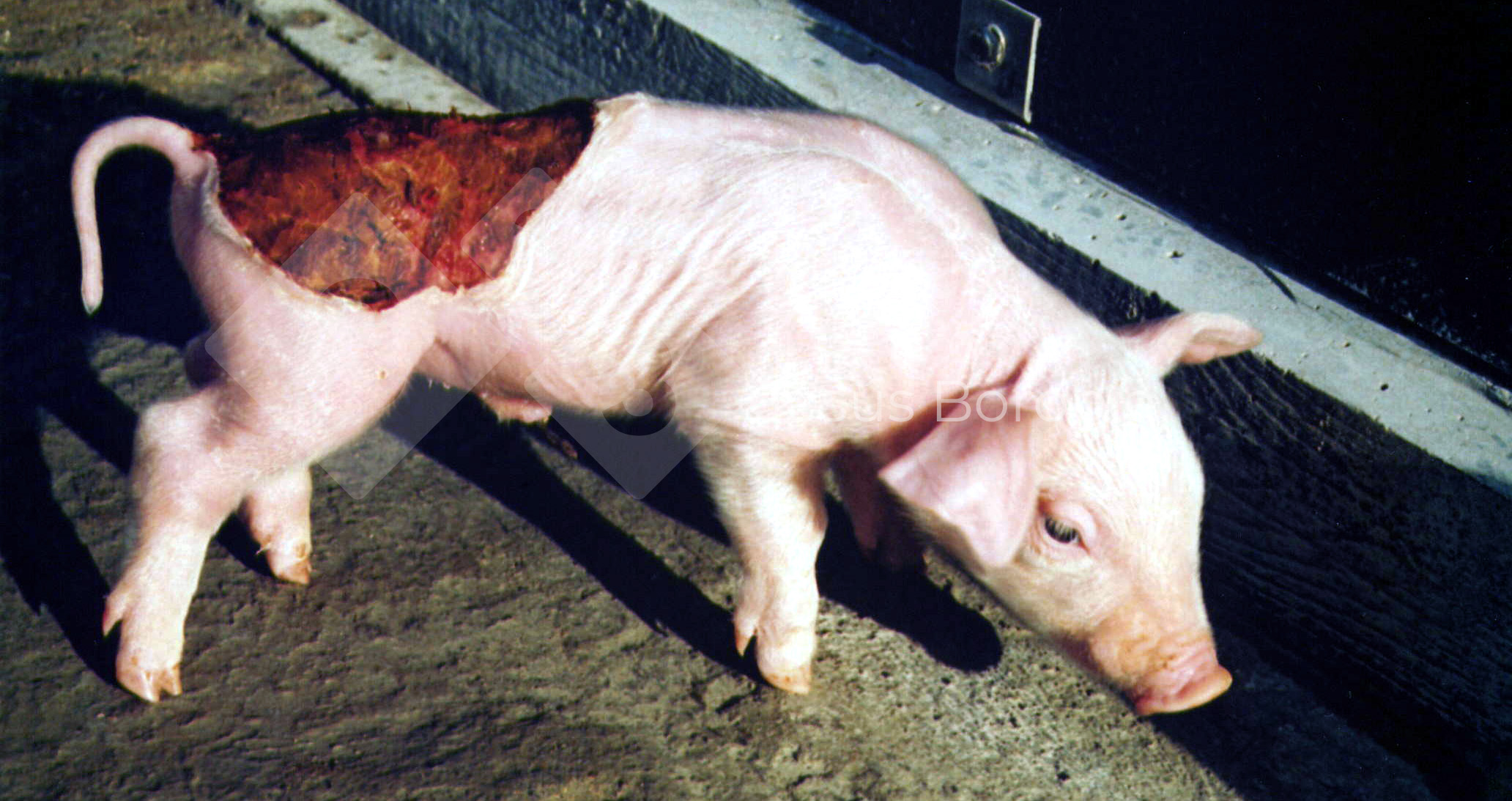 Absence of an area of skin over a part of the back, loin and thigh corresponds to an epitheliogenesis imperfecta.This is a condition where the piglet is born devoid of an area of skin. It usually occurs in the limbs or flanks and is usually associated with an individual animal (not a litter).