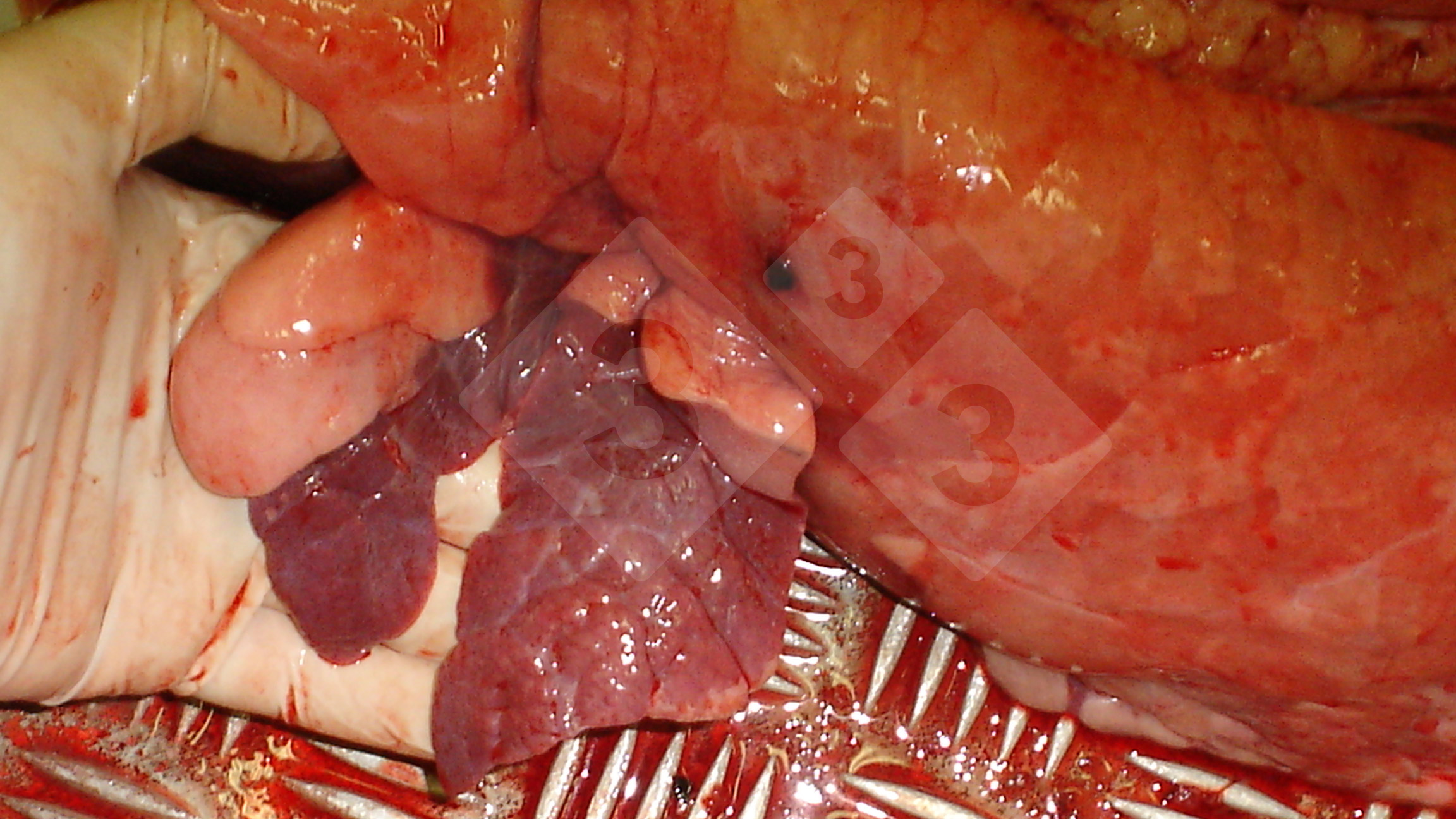 Lung lobes had a well demarcated cranioventral consolidation during a routine herd health check in the slaughterhouse caused by Mycoplasma hyopneumoniae.