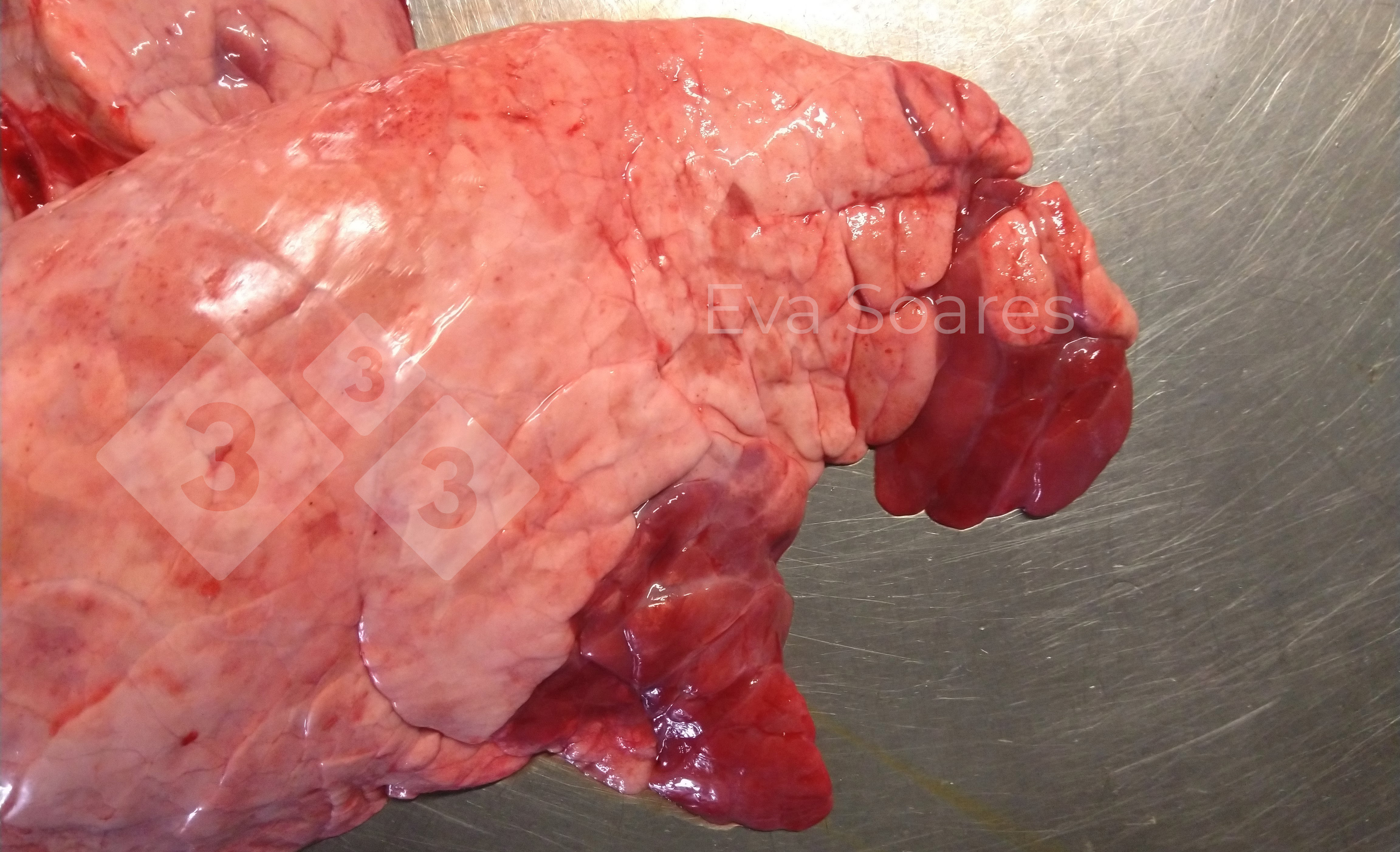 These lung lesions, found at the slaughterhouse in a fattening pig, are compatible with enzootic pneumonia, a highly contagious disease characterized by high morbidity, low mortality, chronic cough and impaired growth. Its etiological agent is Mycoplasma hyopneumoniae, and transmission may occur through direct contact with the respiratory secretions of the carrier pig or by aerosols. Affected lung areas are consolidated and well delimited in relation to normal tissue. Acute lesions are purple red and considerably denser in consistency, similar to that of the liver. Chronic lesions are grey.