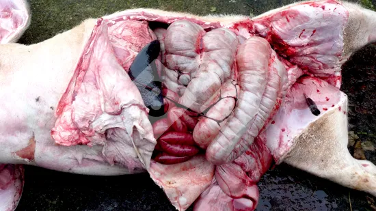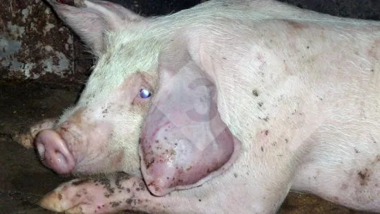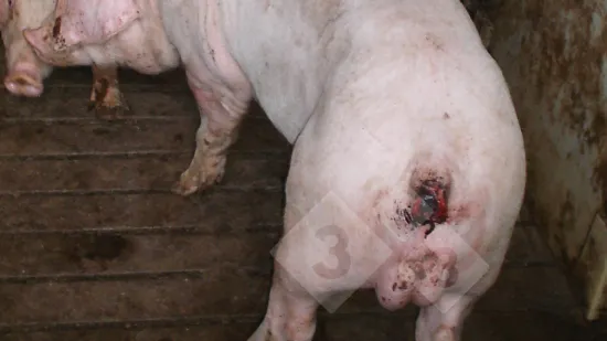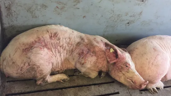 A sow is found with skin lacerations in the pen. What is the cause of this condition?