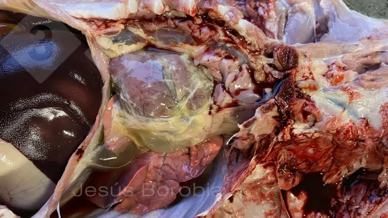 This image of a cross-section of a pig lung is characteristic of a pneumonia caused by: