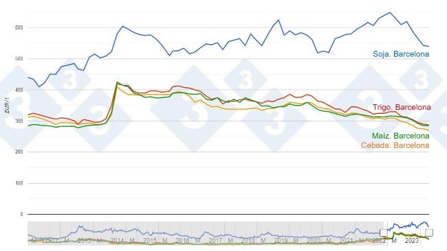 sobre los EUR 202/t (15 euros menos que en diciembre) para el disponible en el puerto de Tarragona, el trigo sobre los EUR 218/t para el disponible en el puerto de Tarragona (11 euros por debajo del nivel del mes pasado) y la cebada destino Lleida en unos EUR 223 /t (11 euros menos en un mes y 9 euros por encima del nivel del maíz destino Lleida). El precio de los cereales disminuye en un mercado con muy poca operativa, unos futuros que se reducen con los fondos aumentando sus posiciones cortas y con la llegada del maíz ucraniano.