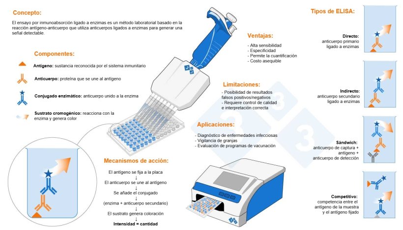 Esta infografía ofrece una visión general objetiva de los mecanismos de acción, los componentes estructurales y las principales variantes de este inmunoensayo basado en la unión antígeno-anticuerpo.