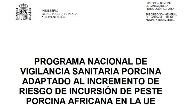 El Ministerio de Agricultura español ha publicado el Programa Nacional de Vigilancia Sanitaria Porcina adaptado al incremento del riesgo de incursión de peste porcina africana en la UE.