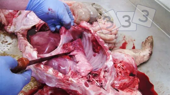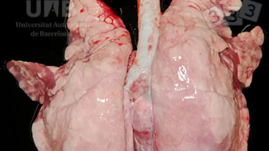 Esta imagen del corte transversal de un pulmón de cerdo es característica de una neumonía causada por: