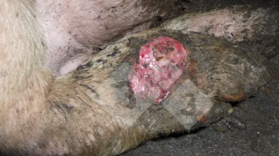 Varios cerdos de acabado presentan pododermatitis ulcerativa en la parte externa de sus patas, lo que les produce cojeras. ¿A qué es debida esta lesión?