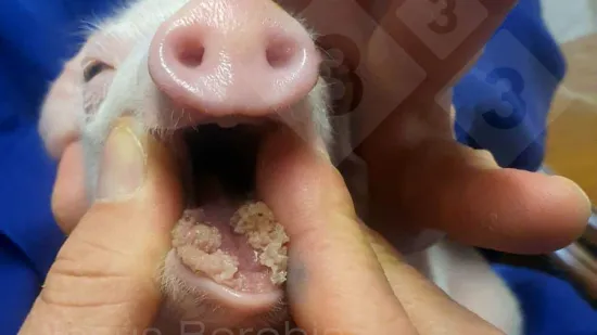 Vemos masas irregulares abultadas en la mucosa oral del labio inferior de un lechón de dos semanas. ¿Cuál es la causa más probable de esta lesión?