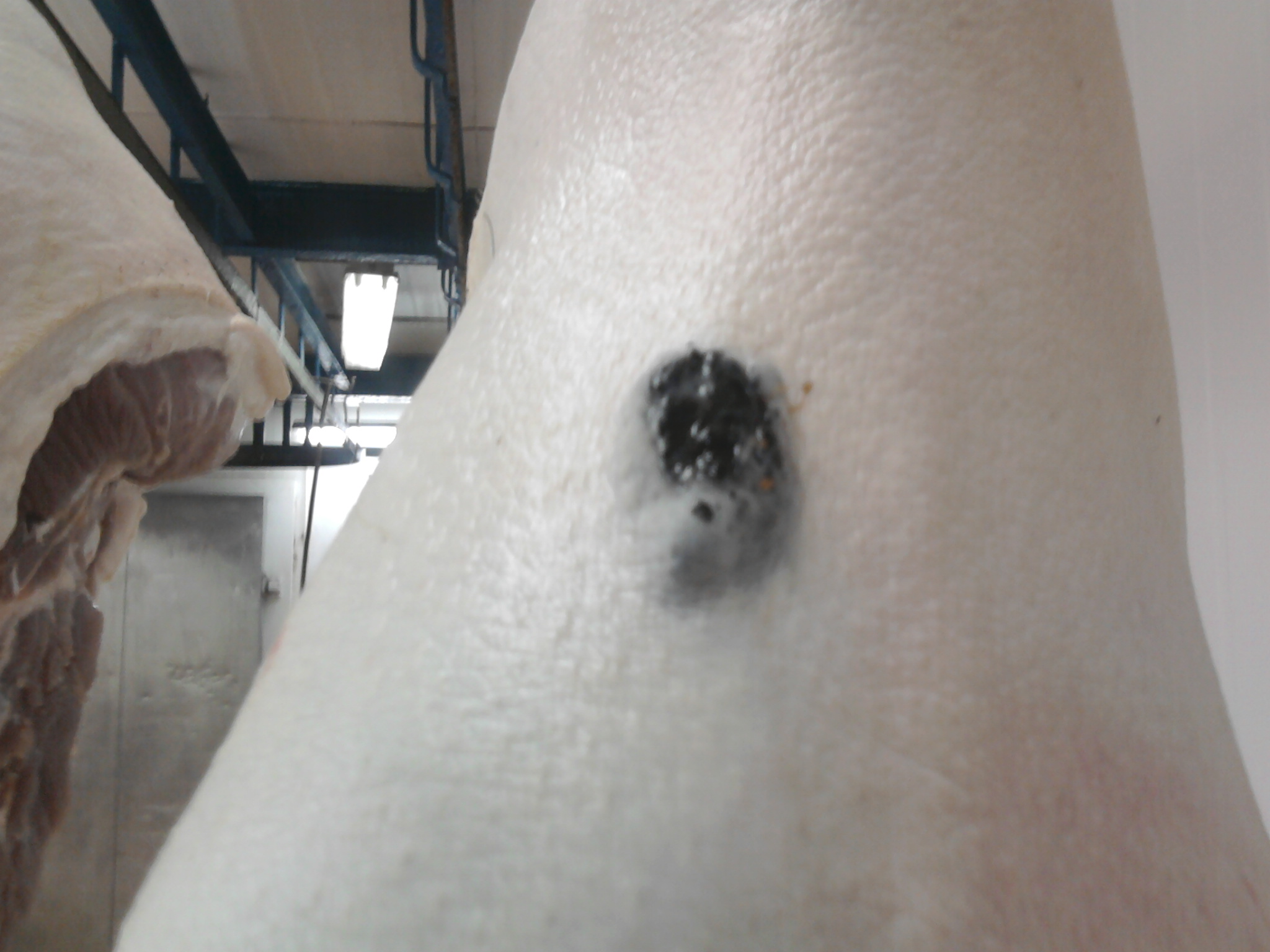La primera foto muestra la lesion en la parte externa y delantera de la pierna derecha del cerdo.