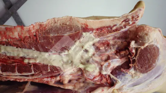 Esta imagen del corte transversal de un pulmón de cerdo es característica de una neumonía causada por: